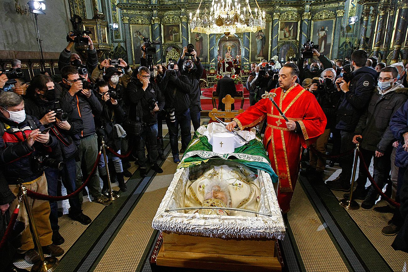 Telo preminulog patrijarha Irineja izloženo je u Sabornom hramu u Beogradu, gde je u toku liturgija, a vernici i poštovaoci odaju počast preminulom patrijarhu.