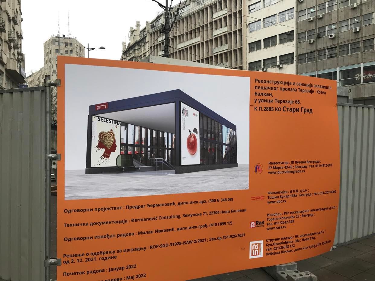 Pre nekoliko dana počela je rekonstrukcija podzemnog prolaza na Terazijama, kod hotela „Balkan“. Radovi su trebali da počnu u novembru prošle godine, kako je tada najavio zamenik gradonačelika Beograda Goran Vesić.