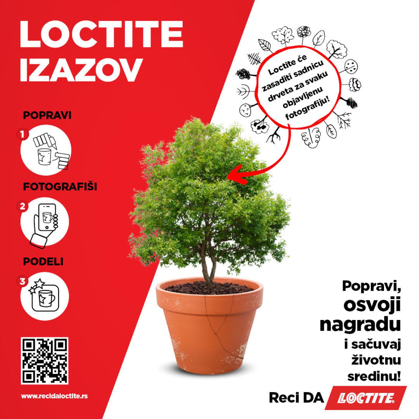 Loctite omogućava popravljanje stvari, samim tim smanjenje trošenja resursa i stvaranja otpada, i ovo su teme koje želimo da osvestimo kod korisnika. Drago nam je da baš ove teme sve više dobijaju na značaju i očekujemo da će se ovaj trend nastaviti i u budućnosti. U skladu sa tim smo pokrenuli kampanju kojom pozivamo ljude da ne bacaju stvari koje su se polomile ili pokvarile već da ih ili poprave ili im pruže novu namenu. Kako mi to volimo da kažemo, želimo da pružimo stvarima drugu šansu. I pozivamo što više ljudi da nam se pridruži. Pokrenuli smo TV i digitalnu kampanju koja podržava Loctite izazov – potrebno je da odete na sajt recidaloctite.rs, da se registrujete i pošaljete fotografiju predmeta koji ste popravili po svom izboru i možete da osvojite lepe nagrade. Međutim, učestvovanjem doprinosite višem cilju jer planiramo da za svaku ubačenu fotografiju posadimo jednu sadnicu drveta. Pored Srbije kampanju spovodimo i u Hrvatskoj, Sloveniji i Bosni I Hercegovini.