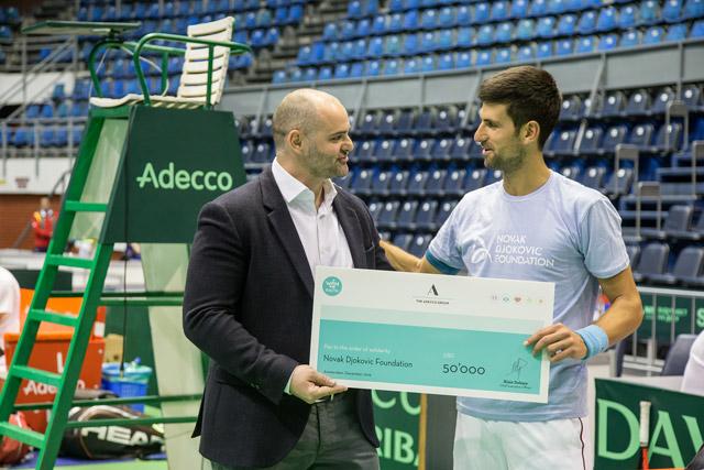 Sredstva obezbeđena nakon ostvarenja globalnog cilja Win for Youth (W4Y ) humanitarne inicijative, Adecco Grupa je ove godine donirala Fondaciji Novaka Đokovića. Našem najboljem teniseru, vaučer je uručio Marko Kolenc, direktor kompanije Adecco u Srbiji, tokom priprema za Davis Cup, na terenu Hale Aleksandar Nikolić u Beogradu.
