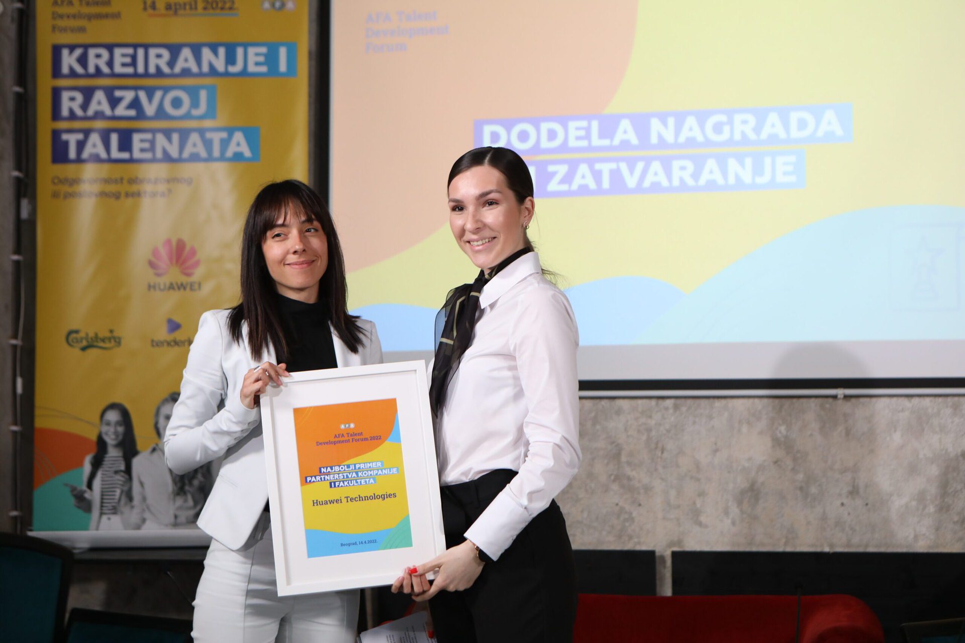 „Kompanija Huawei usmerena je na unapređenje digitalnih veština mladih i njihovo podsticanje da prepoznaju strast prema nauci i budu spremni da je istražuju. Mi imamo priliku da pružimo mladim talentima mogućnost da rade i uče kod nas i trudimo se da im svima obezbedimo jednake šanse da svoje znanje primene u potpunosti. Uspešno sarađujemo sa tehničkim fakultetima u Beogradu, Novom Sadu, Kragujevcu, Nišu i Čačku i kroz razne programe kao što su Seeds for the Future, Women in tech, 1.000 dreams i slično, dajemo svoj doprinos u rešavanju ovog pitanja. Na godišnjem nivou imamo više od 40 studenata koji pohađaju praksu u našoj kompaniji i često po završetku iste imaju mogućnost da ostanu da rade kod nas. Izuzetno smo ponosni na to što je organizacija AFA prepoznala našu posvećenost u ovoj oblasti i dodelila nam nagradu za Najbolji primer partnerstva kompanije i fakulteta“, izjavila je Tadić.