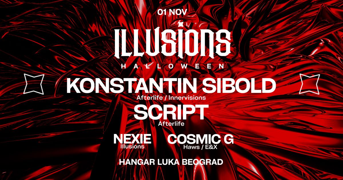 ILLUSIONS HALLOWEEN najavljuje veliku žurku pod maskama, koja će se održati 01.11. u Hangaru u Luci Beograd. Nakon niza događaja na kojima su nastupali svetski hedlajneri, otvaranje zimske sezona ILLUSIONS serijala započinjemo sa još jačom muzičkom postavom, zvezde Afterlife-a DJ i producent KONSTANTIN SIBOLD, zatim DJ i producent SCRIPT , kao i domaćom podrškom DJ NEXIE i DJ i producent COSMIC G.