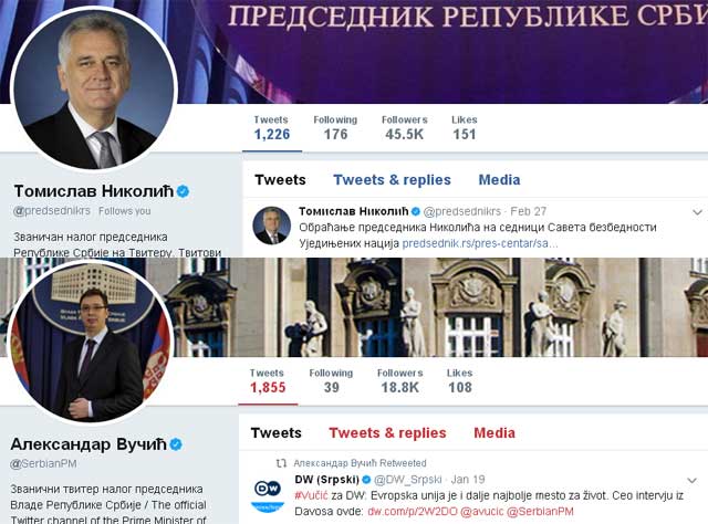 Tviter nalog predsednika Srbije prati nešto preko 45 hiljada fanova, a na Tviter nalogu premijera Srbije ( @SerbianPM ) ih je preko 18 hiljada. Ovaj nalog će najverovatnije preuzeti Ana Brnabić, ali pitanje je da li će i u njenom slučaju biti ovako ažurni kao kod naloga predsednika.
