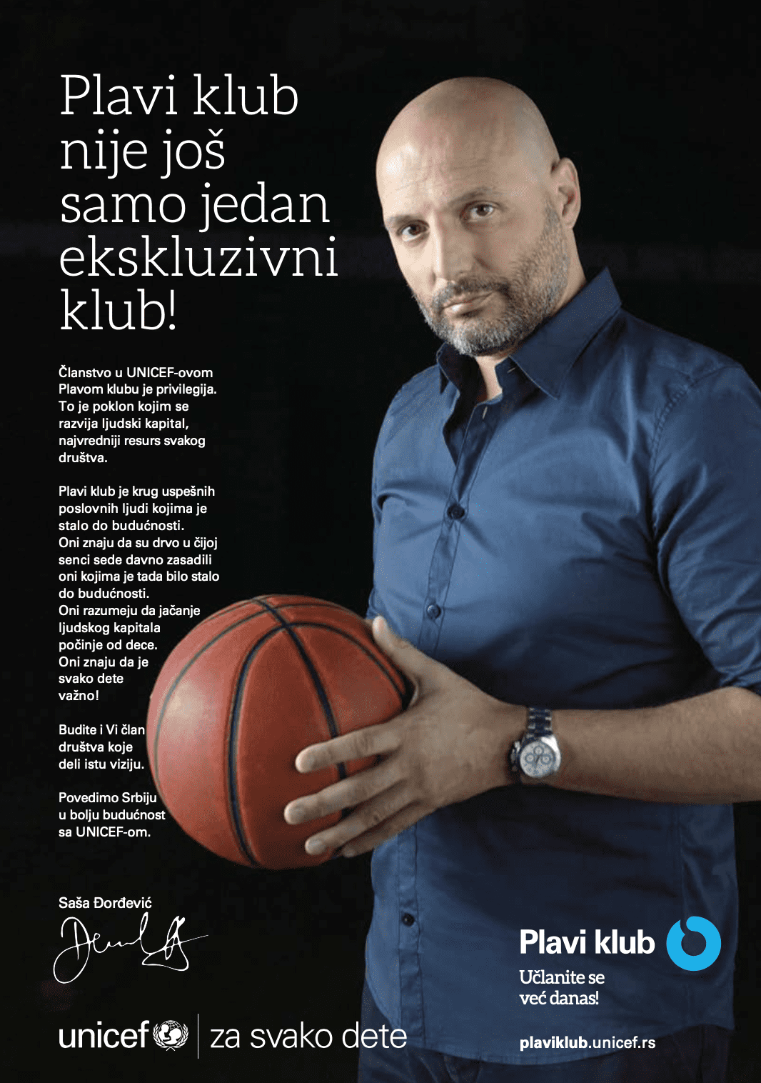„Samo zajedno možemo da stvorimo jednake šanse za svako dete i zato vas pozivam da aktivirate svoje članstvo u Plavom klubu UNICEF-a“, izjavio je Aleksandar Saša Đorđević.