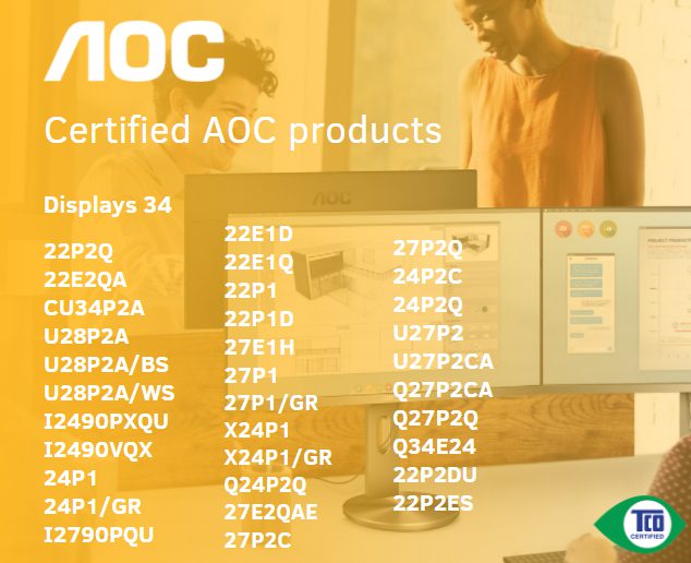 Stručnjak za monitore AOC s ponosom objavljuje da postaje jedan od prvih proizvođača monitora koji je dobio sertifikat TCO 9. generacije. Sertifikat TCO 9. generacije za monitore objavljen je tek nedavno, 1. decembra 2021., a AOC s 34 monitora kojima je dodeljena ta oznaka ima treći najveći portfolio modela sa sertifikatom TCO na tržištu.