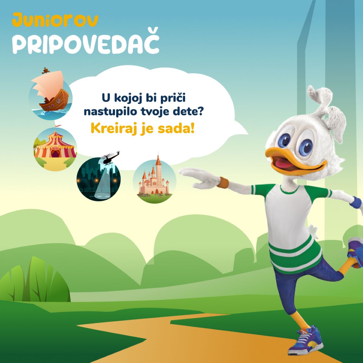 Juniorov Pripovedač je novi segment na platformi koja već sadrži edukativne e-knjige i zanimljive igre, a ujedno i najinteresantniji segment za buđenje mašte kod dece, stvaranje jednog imaginarnog sveta ispunjenog različitim avanturama, sa poukama o dobroti, ljubavi, prijateljstvu… Platforma je interaktivna i korisnik izborom pola, imena i uzrasta deteta, kroz Junior Pripovedač uz pomoć ChatGPT-a, kreira personalizovanu jedinstvenu priču sa detetom u glavnoj ulozi.