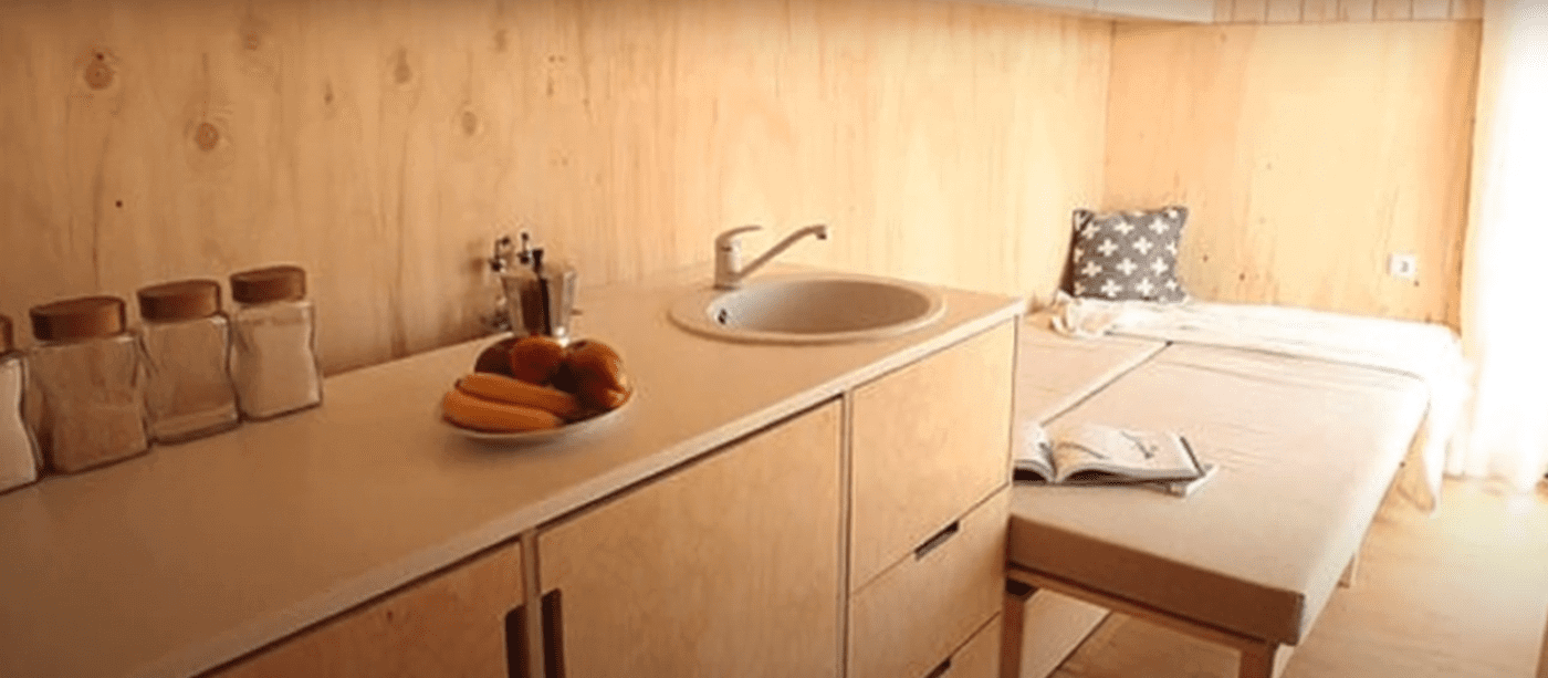 Od male kuhinje koja je opremljena svim potrebnim uređajima koji je uglavnom vešto skriveni, pa do mini sofe koja se u samo nekoliko poteza pretvara u udoban ležaj, baš sve što je zamislila dizajnerka je uspela da smesti u enterijer.