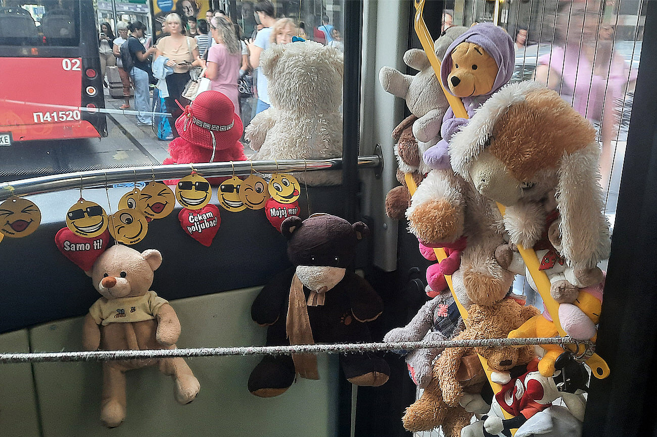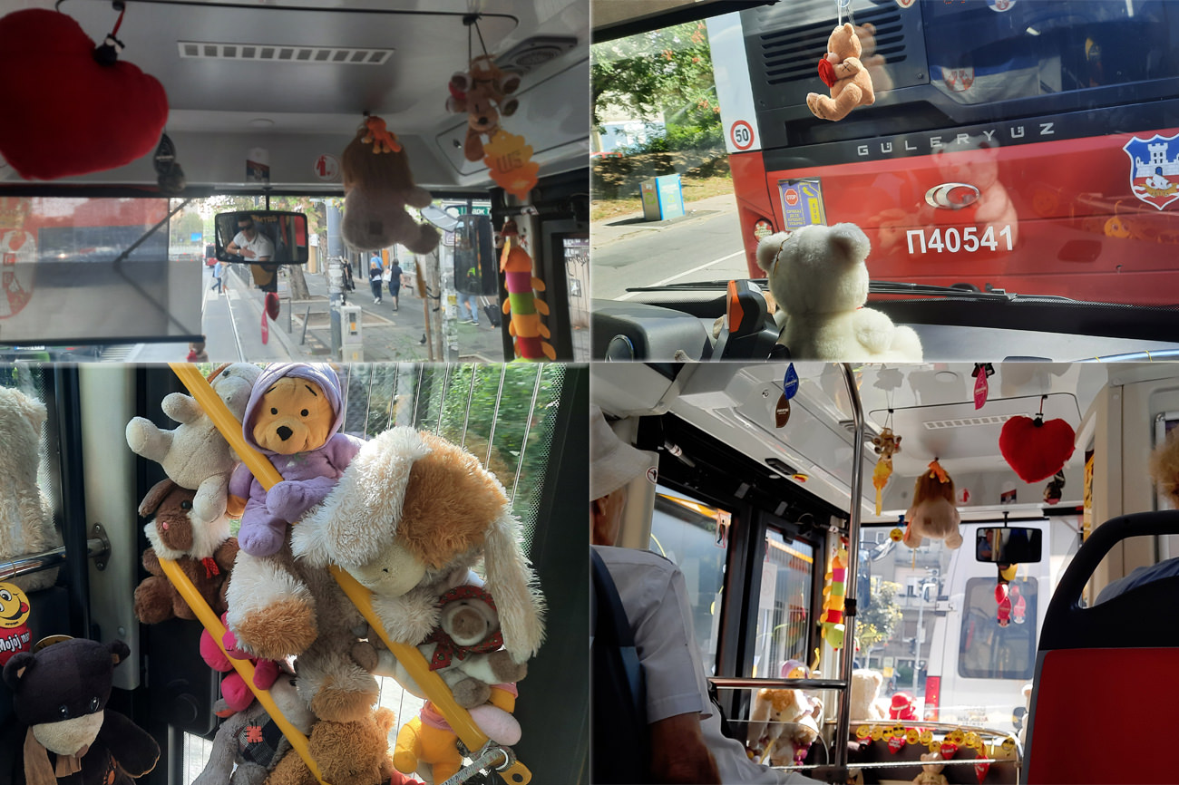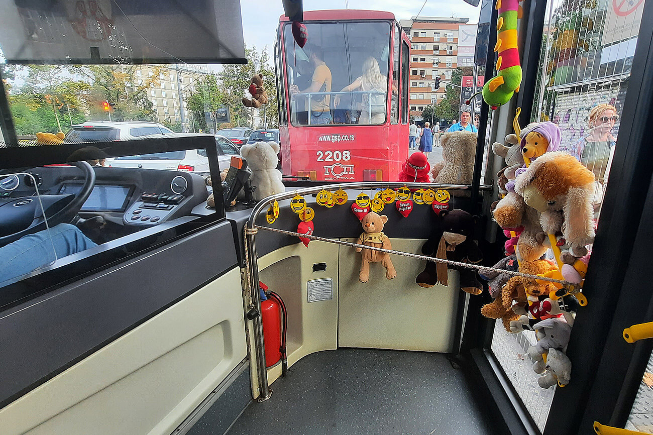 „Ulovili“ smo jedan od najinteresantnijih autobusa gradskog prevoza u Beogradu. Reč je o vozilu čiji vozač je odlučio da na najbolji način iskoristi igračke svoje sestričine koja ih je prerasla i ceo prednji deo autobusa ukrasi plišanim medama, smajlijima i srcima…