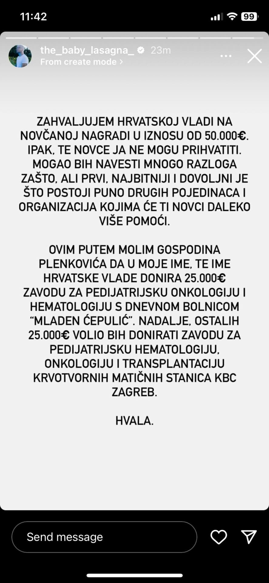 Baby Lasagna od hrvatske Vlade dobio 50.000 evra: Evo šta će uraditi sa novcem