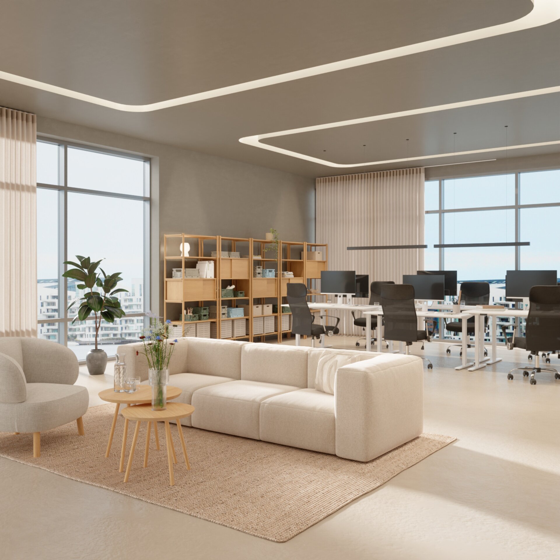 Zona za pauze i neformalne sastanke – Lounge delovi, prirodni tonovi i dekorativne biljke stvaraju ambijent u kojem zaposleni mogu da obnove energiju i razmene ideje.