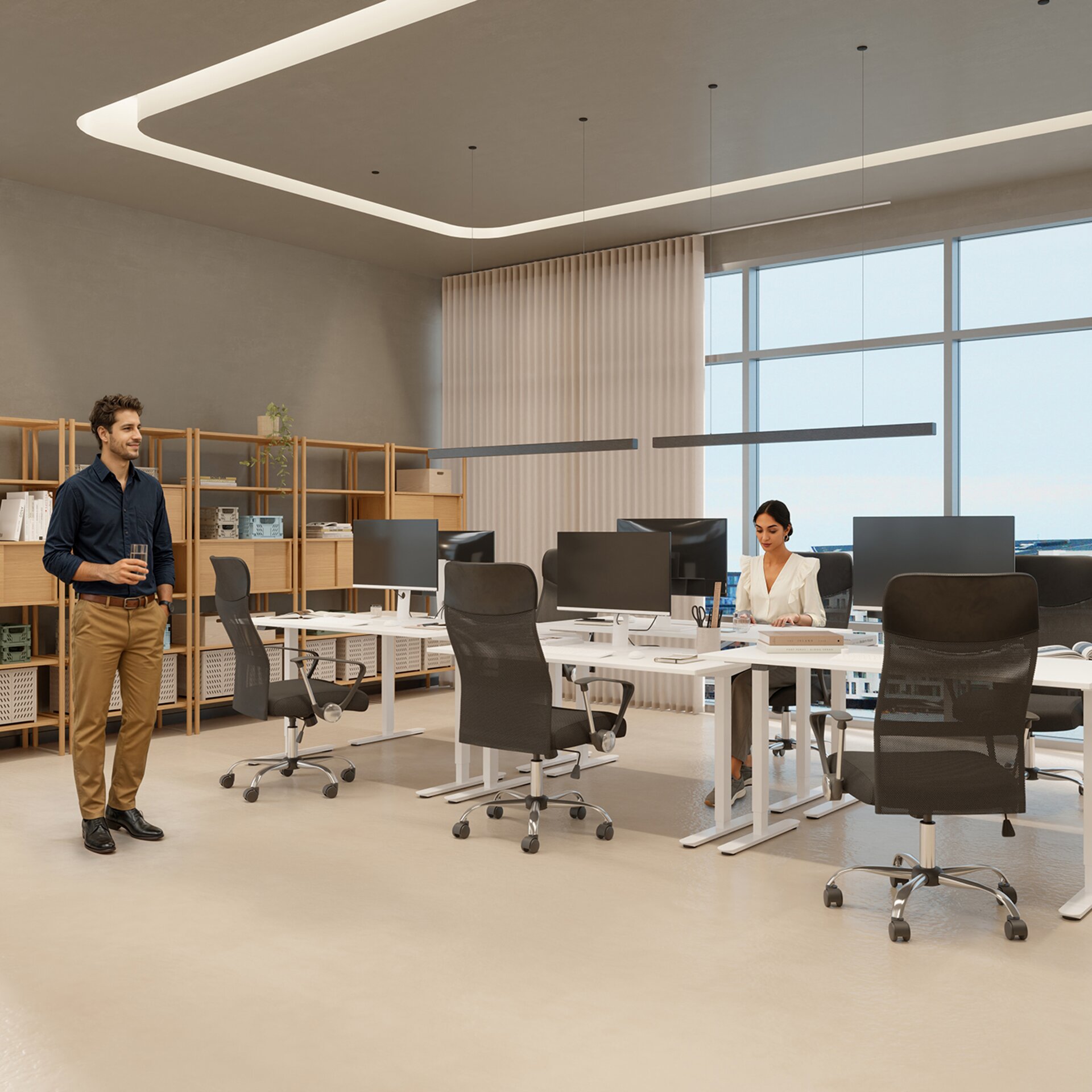 Podesivi radni stolovi i ergonomične stolice – Minimalistički dizajn i udobnost omogućavaju dugotrajan rad bez kompromisa po zdravlje i koncentraciju.
