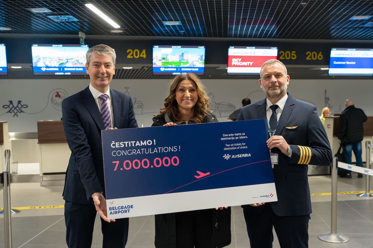 Sedmomilionitog putnika su na šalterima za čekiranje na novom Terminalu 2 dočekali generalni direktor kompanije Belgrade airport, Fransoa Berizo i izvršni direktor za saobraćaj avio-kompanije Air Serbia, Milan Malović, koji su gospođi Aleksandri Kandić iz Valjeva uručili poklon – vaučer za besplatno povratno putovanje za destinaciju po izboru. Gospođa Kandić je putovala direktnim letom nacionalnog avio-prevoznika Air Serbia za Lisabon.