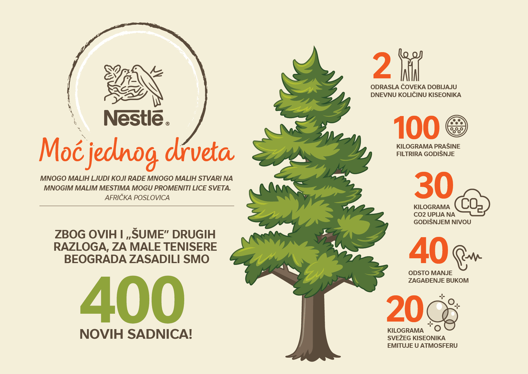 „Da li ste znali da samo jedno stablo godišnje proizvodi dovoljno kiseonika za dva odrasla čoveka, apsorbujući u isto vreme ugljen-dioksid, a da njegova krošnja fizički zadržava štetne PM čestice (finu prašinu koja nastaje nepotpunim sagorevanjem fosilnih goriva)? Urbane sredine naročito su ugrožene, te ozelenjavanje istih znači obezbeđivanje čistijeg vazduha, naročito važnog za decu koja sportske aktivnosti često upražnjavaju na otvorenom prostoru. Ovakvim akcijama čuvamo planetu i ulažemo u naše mlade teniske nade“, istakla je Marjana Davidović, generalna direktorka kompanije Nestlé za Srbiju, Crnu Goru i Severnu Makedoniju.