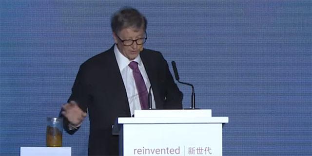 Milijarder i filantrop Bil Gejts s teglom ljudskog izmeta pored sebe na podijumu, otvorio je danas sajam novih toaleta u Pekingu (Reinvented Toilet).