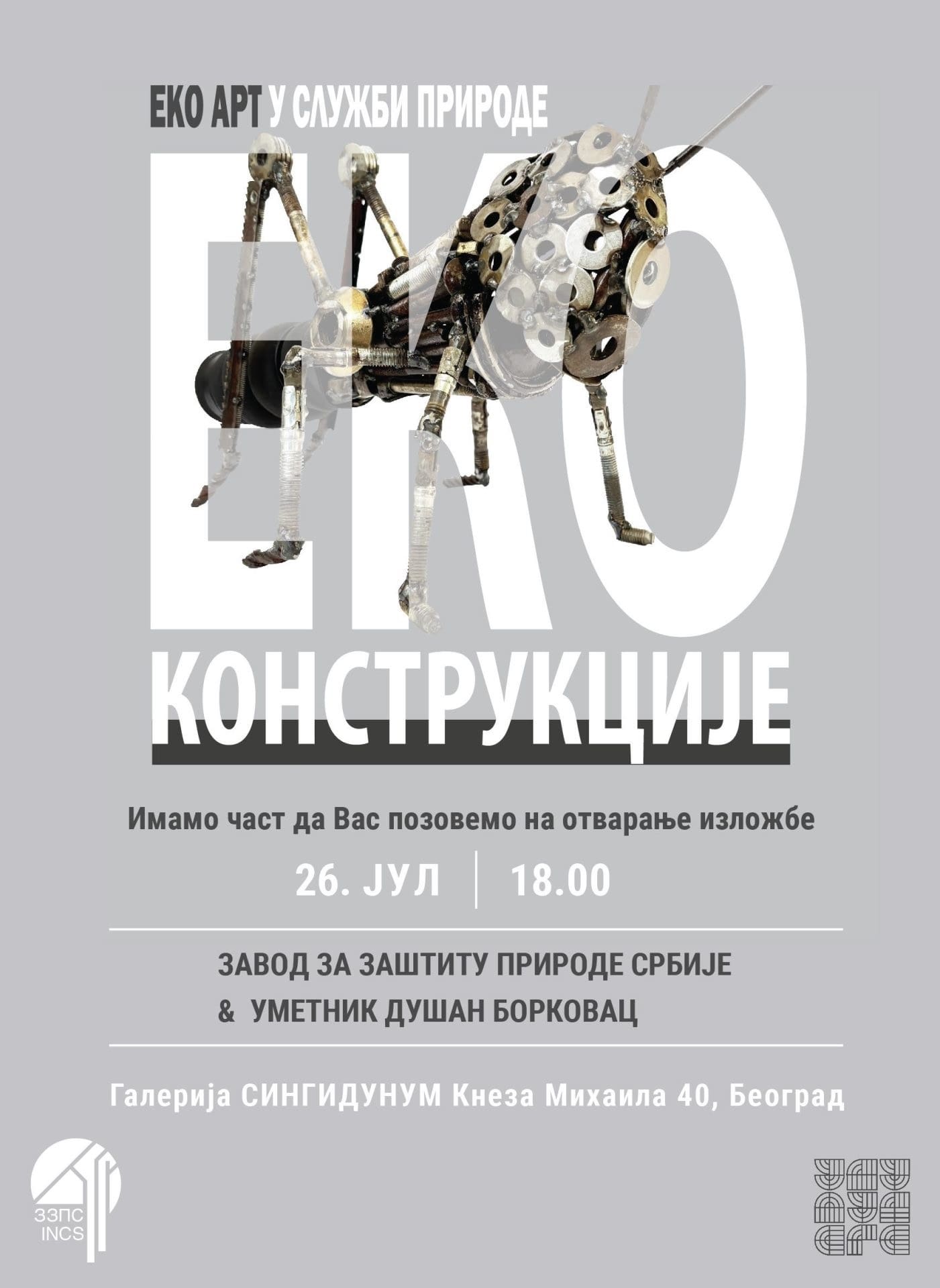 U Galeriji Singidunum, 26. jula u 18 časova biće otvorena izložba skulptura „Eko konstrukcije: eko art u službi prirode“, autora Dušana Borkovca u organizaciji Zavoda za zaštitu prirode Srbije. Skulpture su izrađene od starih i iskorišćenih podloški, šrafova, elektroda za zavarivanje, matica, burgija, anker vijaka, testerica i drugih industrijskih delova koji su spajanjem (zavarivanjem) dobili novu utilitarnu vrednost, a time i novi život u eko-art skulpturi inspirisanoj životinjskim vrstama koje naseljavaju prostor naše zemlje.