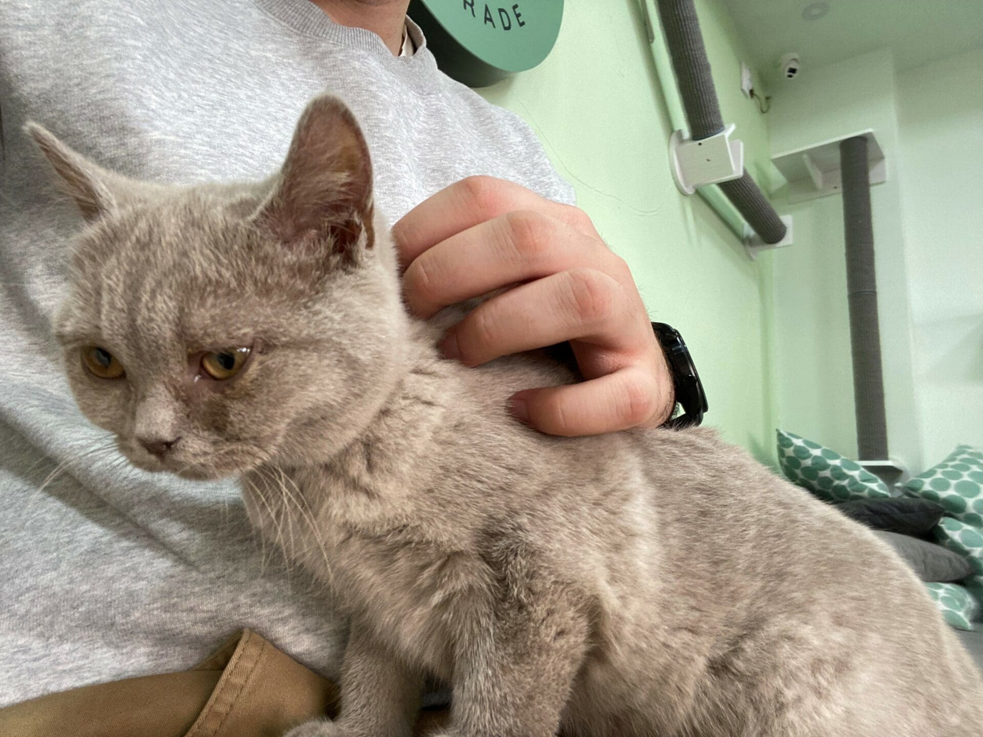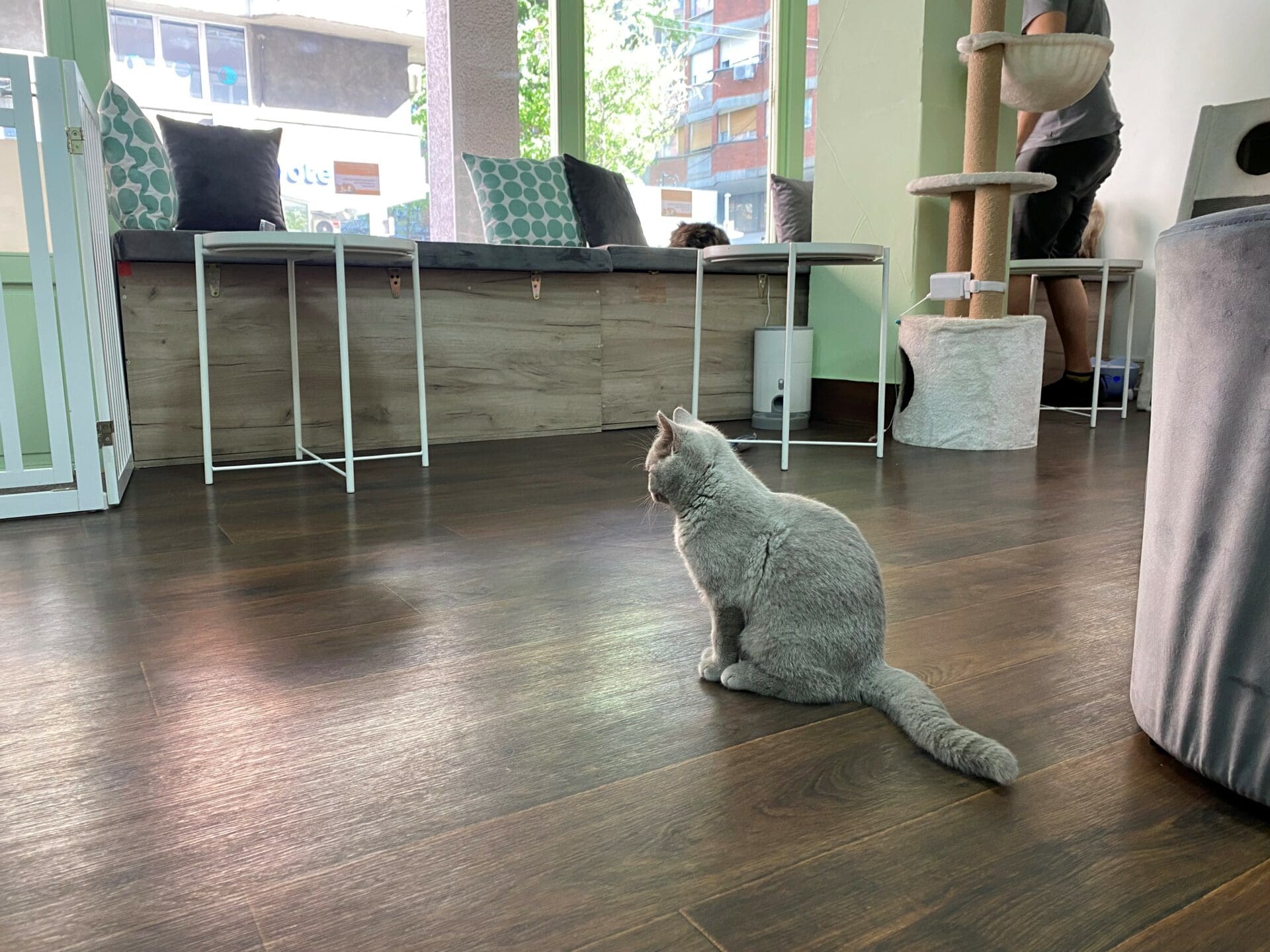 Na ulazu nas dočekuje Borivoje Jovanović, jedan od osnivača ovog kafića i napomnje da moramo da navučemo jednokratne navlake na patike i dezinfikujemo ruke. Dva minuta nakon toga, dok se sredstvo ne osuši, nije dozvoljeno dirati mace. Ali uprkos tome one žele da se igraju i odmah skaču u krilo.