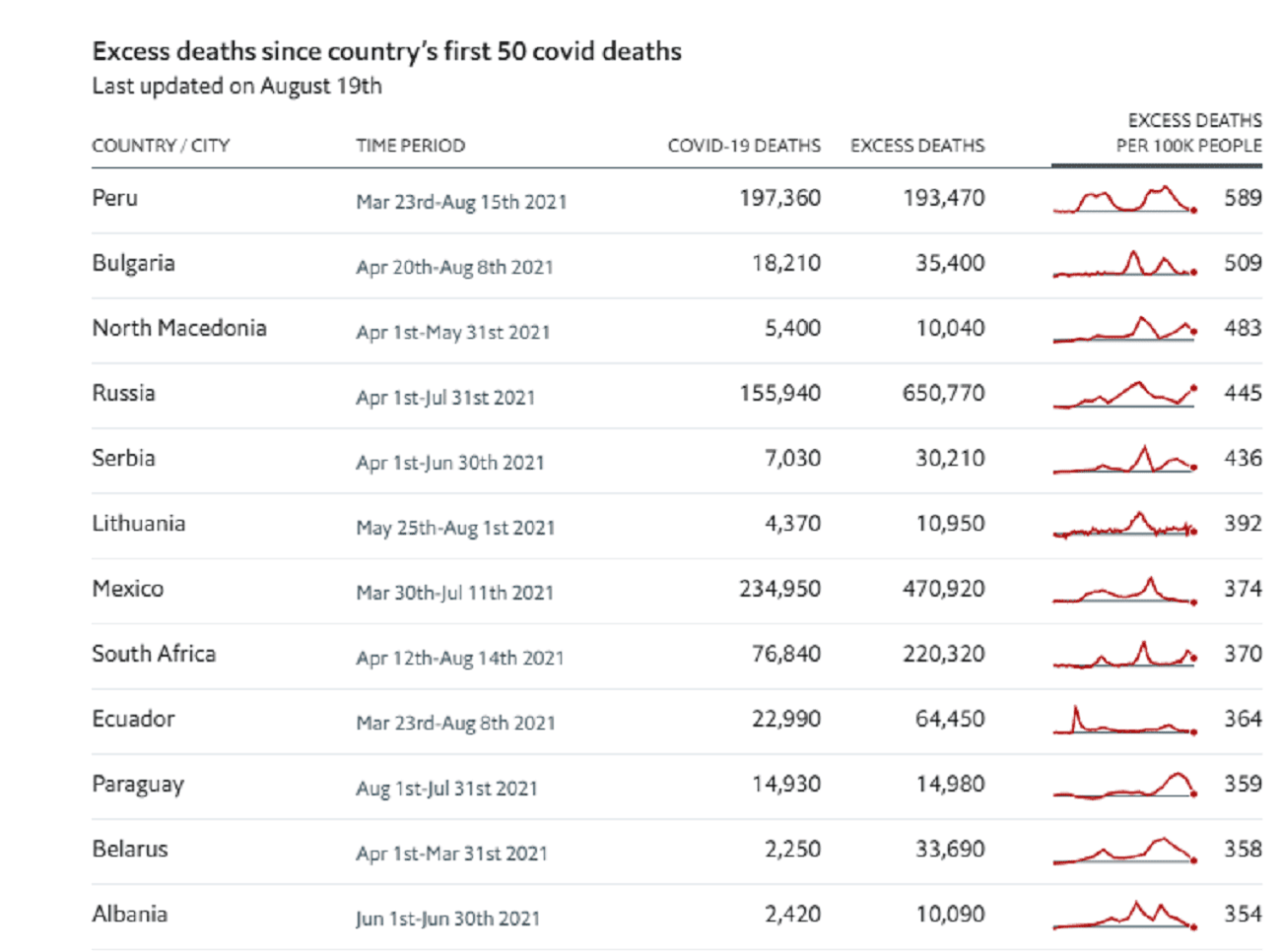 Srbija se nalazi na petom mestu liste zemalja sa najvećim „viškom smrtnosti“, koji ukazuje na potencijalnu razliku između prijavljenog i stvarnog broja smrtnih slučajeva od posledica kovida-19, objavio je britanski magazin Ekonomist, pozivajući se zvanično objavljene podatke za period od 1. aprila 2020. godine do 30. juna ove godine.
