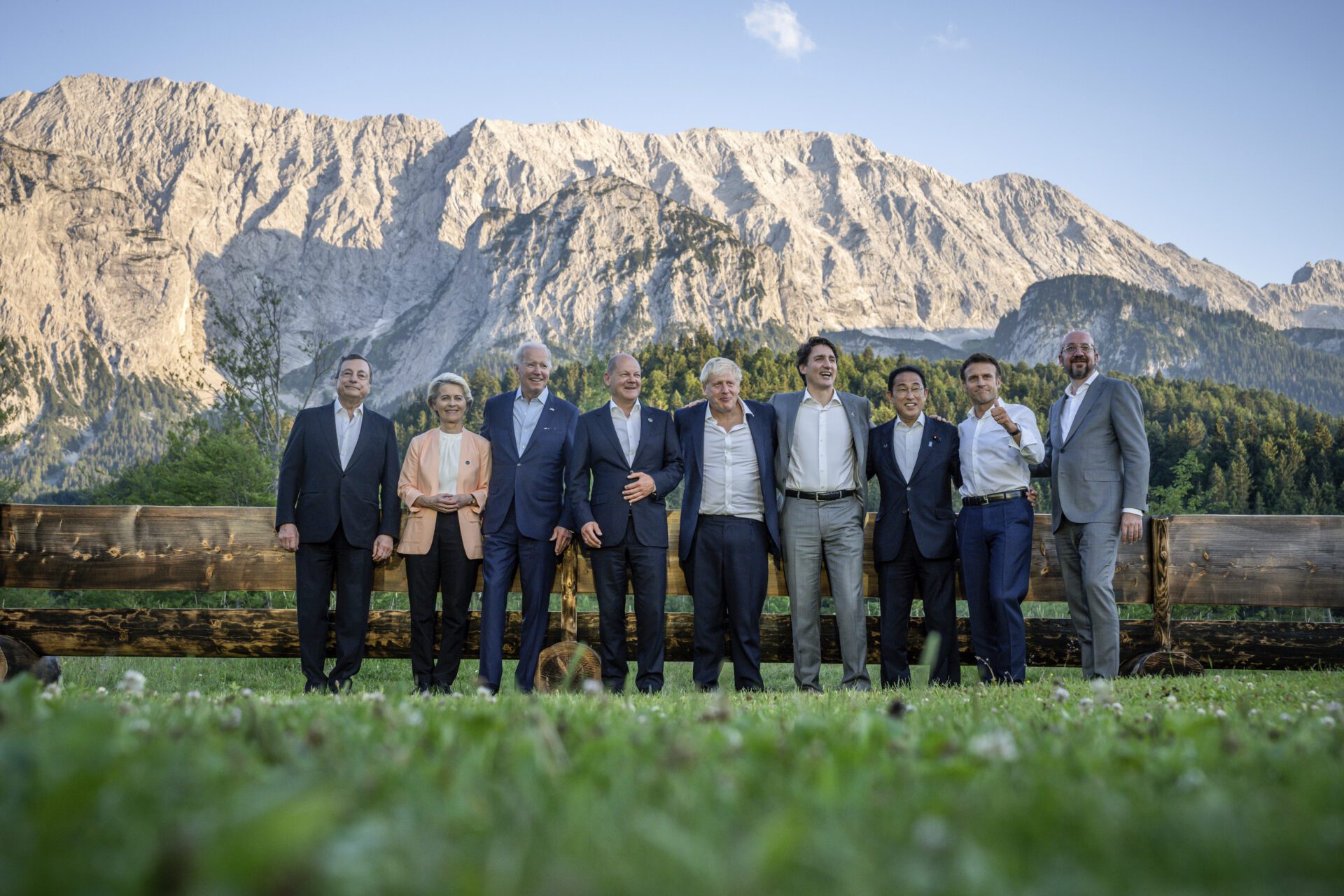 From left, Italy’s Prime Minister Mario Draghi, European Commission President Ursula von der Leyen, U.S. President Joe Biden, German Chancellor Olaf Scholz, British Prime Minister Boris Johnson, Canada’s Prime Minister Justin Trudeau, Japan’s Prime Minister Fumio Kishida, French President Emmanuel Macron and European Council President Charles Michel. (Michael Kappeler/dpa via AP)