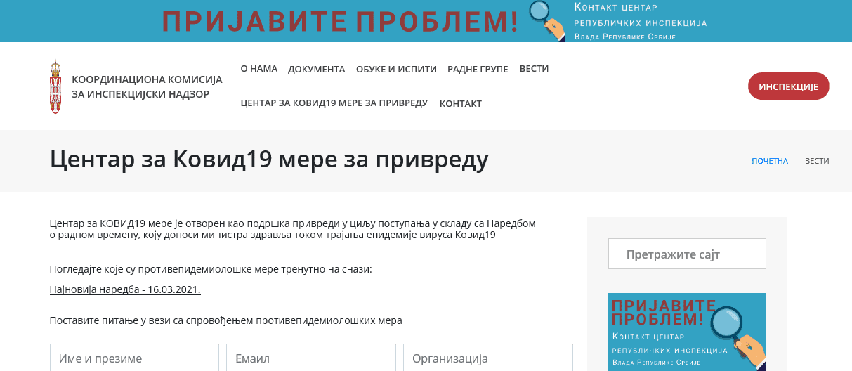 Na sajtu Koordinacione komisije za inspekcijski nadzor danas je počeo da radi Centar za Kovid-19 mere, u okviru kojeg pored najnovijih verzija naredbi i uredbi Vlade Srbije, privreda može da dobije tačnu i pouzdanu informaciju o ograničenjima koje protivpandemijske mere podrazumevaju, a tiču se njihove delatnosti i poslovanja.