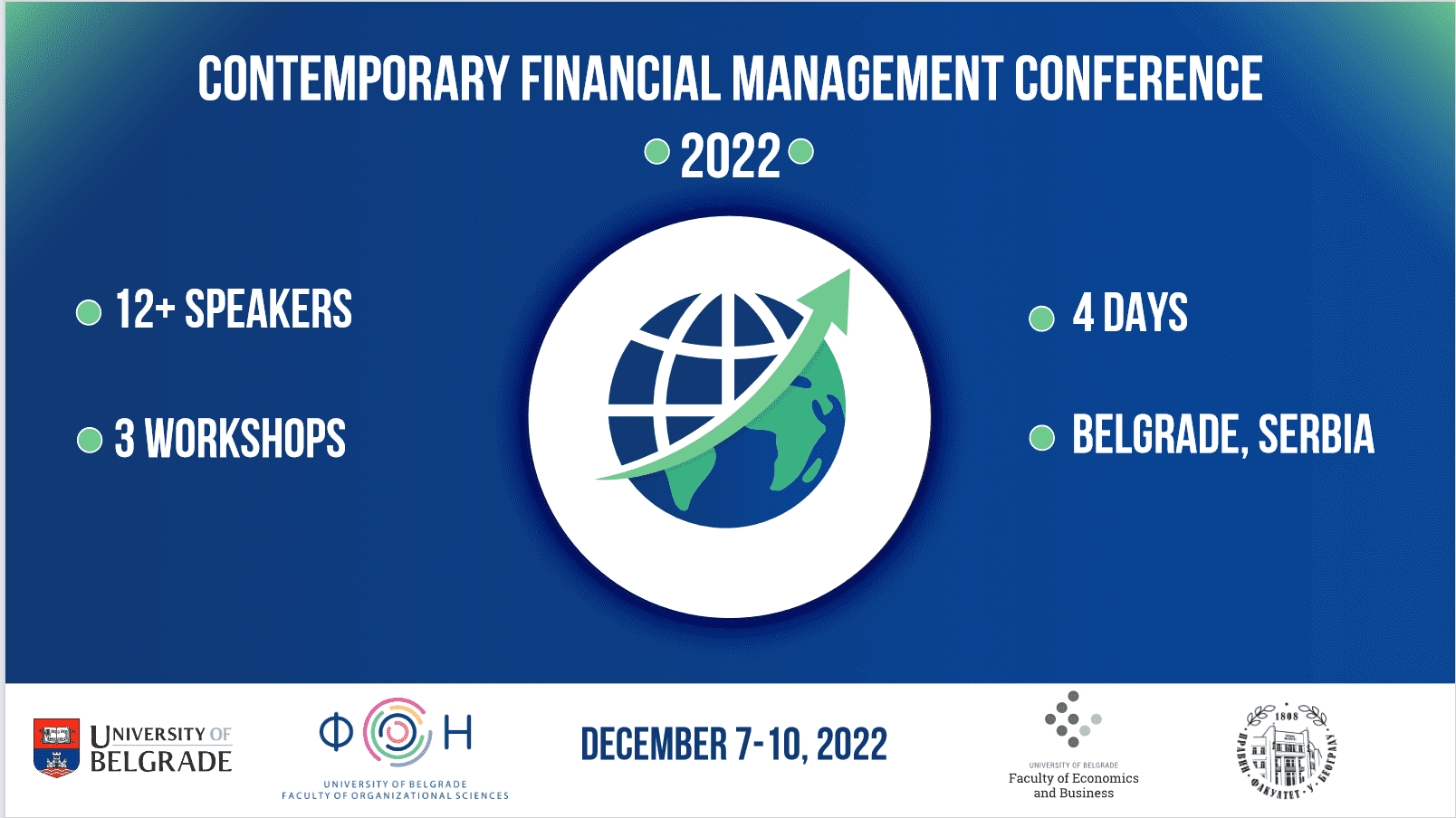 Prva međunarodna konferencija o savremenom upravljanju u finansijskom poslovanju – CFMC|2022 (Contemporary Financial Management Conference) održaće se u Beogradu od 7. do 10. decembra, u organizaciji beogradskog Univerziteta, odnosno Fakulteta organizacionih nauka, Pravnog i Ekonomskog fakulteta. Ova konferencija, koja ima za cilj da postane vodeći forum za oblast upravljanja u finansijama u jugoistočnoj Evropi, okupiće gotovo 200 eksperata i učesnika iz 20 evropskih i svetskih zemalja, iz sektora visokog obrazovanja, biznisa, vlade i civilnog sektora.