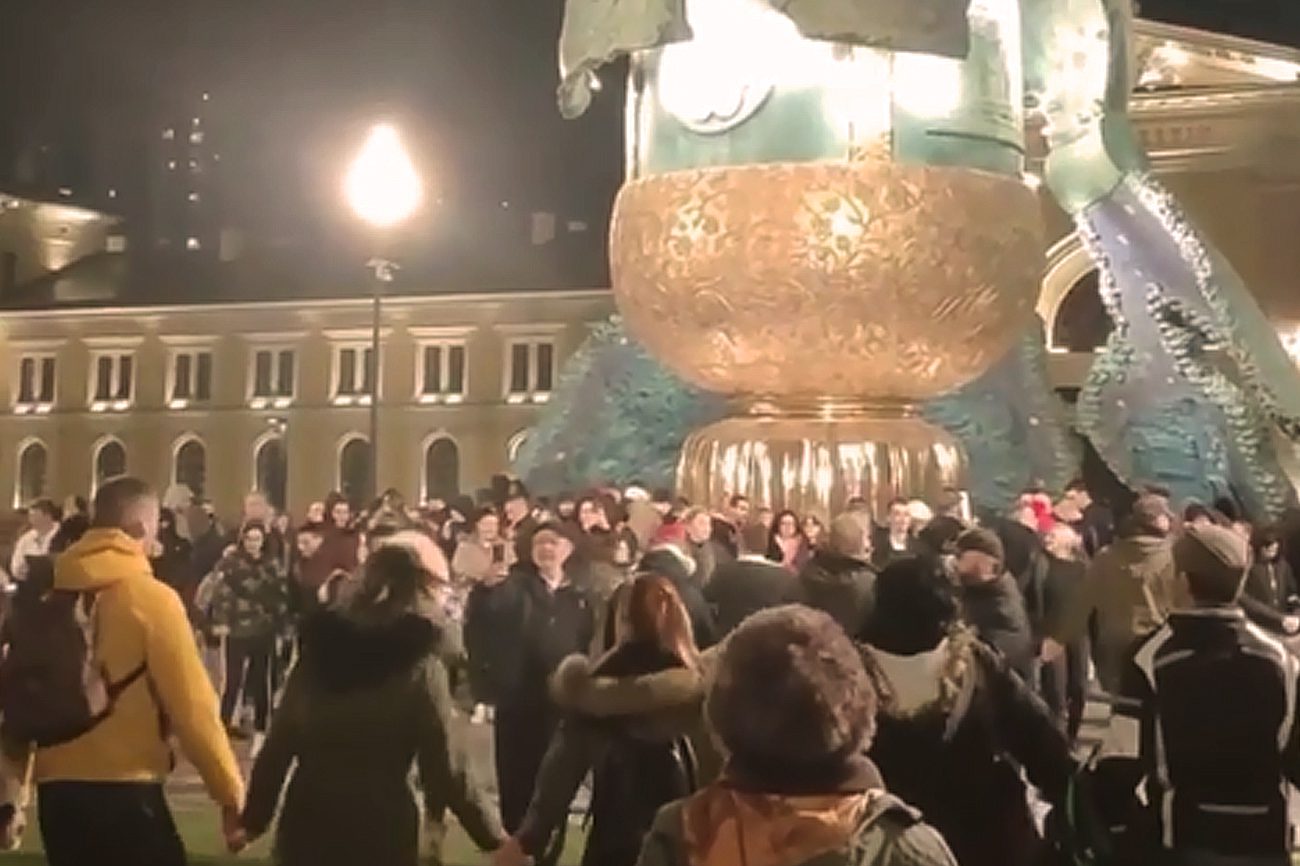 Na stotine ljudi okupilo se subotu uveče na Savskom trgu kod spomenika Stefanu Nemanji, gde su, uprkos hladnom vremenu, u jaknama i sa kapljučama igrali Užičko kolo.