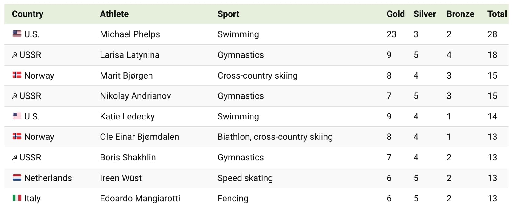 U ovoj grafici prikazano je devet najboljih sportista po ukupnom broju osvojenih olimpijskih medalja. Podaci su preuzeti iz Britanike, zaključno sa 5. avgustom 2024. godine.