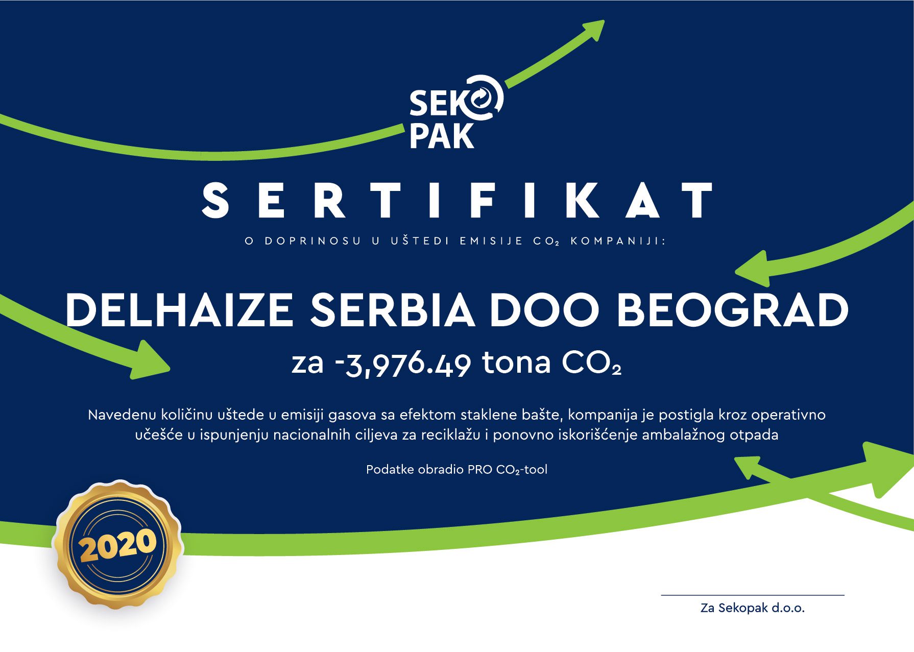 Sekopak dodeljuje sertifikate kompanijama u sistemu operatera, za učinak u smanjenju emisije CO2 u atmosferu, a na bazi plasiranih i recikliranih količina ambalažnog otpada u prethodnoj godini