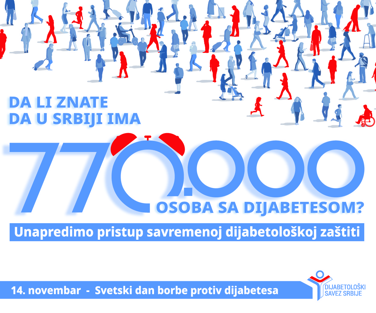 Povodom Svetskog dana dijabetesa 14. novembra, Dijabetološki savez Srbije pokrenuo je kampanju pod nazivom „770.000“. Kampanja poziva na unapređenje pristupa savremenoj zdravstvenoj zaštiti za osobe sa dijabetesom, kojih u Srbiji ima upravo 770.000. Cilj kampanje je da podigne svest javnosti o značaju unapređenja kvaliteta i dostupnosti dijabetološke zaštite, koja predstavlja često jedinu šansu za normalan život za ovaj izuzetno veliki broj ljudi u našoj zemlji.