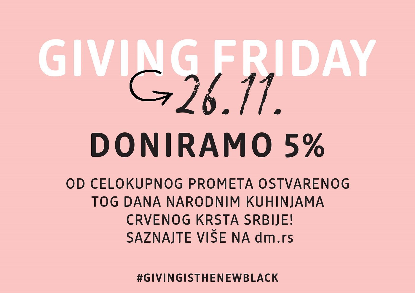 Ovaj globalno popularni dan u kompaniji dm nosi naziv Giving Friday, a navedenu inicijativu drogerijski lanac sprovodi na nivou cele dm Grupe pod sloganom Giving is the new black.