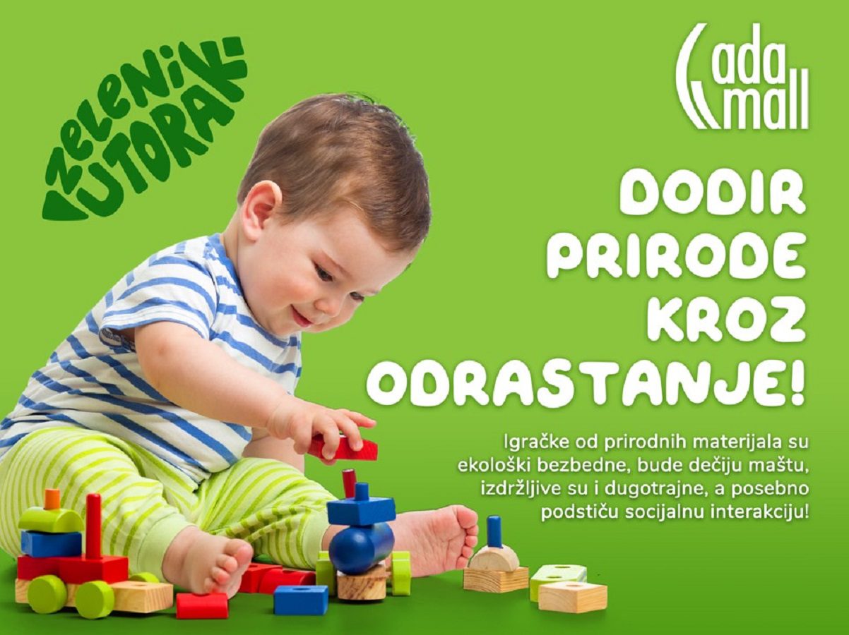 Postoji mnogo razloga zašto su igračke od prirodnih materijala važne – ne samo za vaše dete, već i za životnu sredinu. Ovo je bila glavna ideja kojom smo se vodili prilikom organizacije februarskog izdanja, tradicionale akcije ZELENI UTORAK u ADA MALL-u. Uz uvek atraktivne popuste, 01. februara vas očekuje obilje aktivnosti usmerenih ka podizanju svesti kod roditelja i dece o ekologiji kroz priču o važnosti igračaka od prirodnih materijala i njihovo uključenje kroz odrastanje.