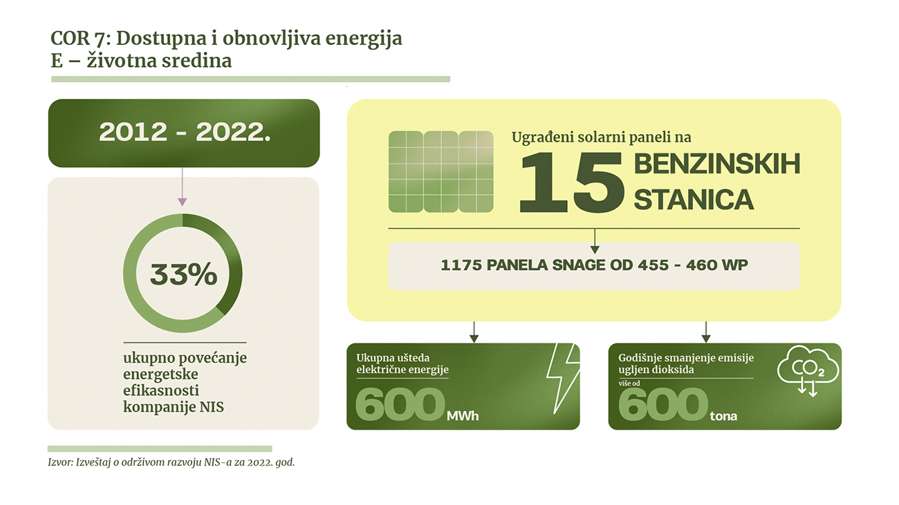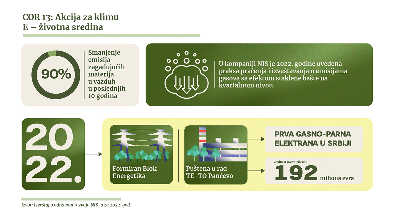 U tom smislu, sprega između država i velikih kompanija ima izuzetan značaj. Jedan od najboljih primera u našoj zemlji je kompanija NIS, koja posluje u skladu sa principima održivog razvoja i svojim aktivnostima doprinosi ostvarenju 12 od 17 ciljeva UN. NIS redovno obaveštava najširu javnost o svim značajnim projektima i aktivnosti iz ove oblasti, te je krajem maja objavljen 13. uzastopni verifikovani Izveštaj o održivom razvoju za 2022. godinu NIS-a pod simboličnim sloganom „Naša održiva zajednica“.