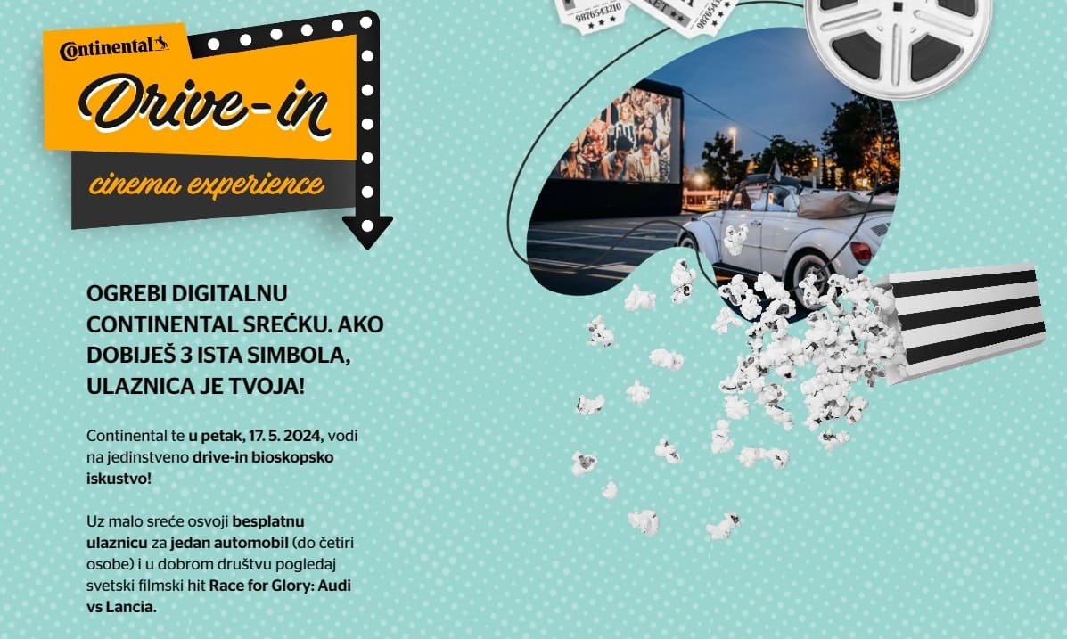 Uz podršku jednog od vodećih proizvođača pneumatika Continental, ovaj bioskop donosi potpuno novi doživljaj gledanja bioskopskih ostvarenja na otvorenom. Ambijent će učiniti da se doživi svaki trenutak ovog uzbuđenja na velikom platnu iz udobnosti sopstvenog automobila, uz uživanje u vrhunskoj produkciji.