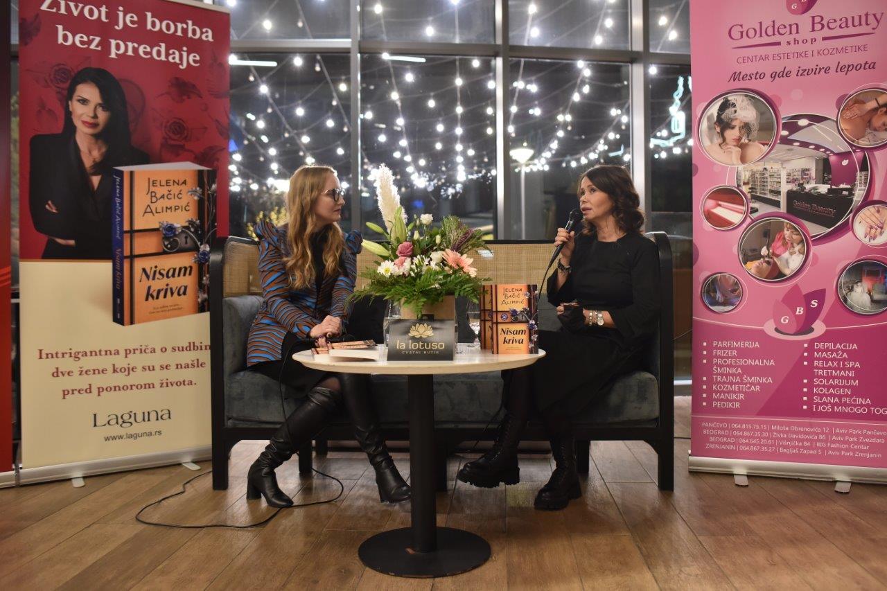 Svaka njena knjiga je bestseler koji pomera granice čitanosti i sa nestrpljenjem se iščekuje. Svaki susret sa njom je događaj ispunjen jakim emocijama i zanimljivim pričama. Tako je bilo i sinoć na trećem spratu beogradskog šoping centra ADA MALL na druženju sa novinarkom i spisateljicom Jelena Bačić Alimpić. Ona je govorila o svom najnovijem romanu „Nisam kriva“, ali i o kompletnom književnom opusu u Laguni koji čini čak 11 knjiga. Ovo je bila prilika da posetioci razgovaraju sa autorkom i dobiju potpisan primerak omiljenog romana.