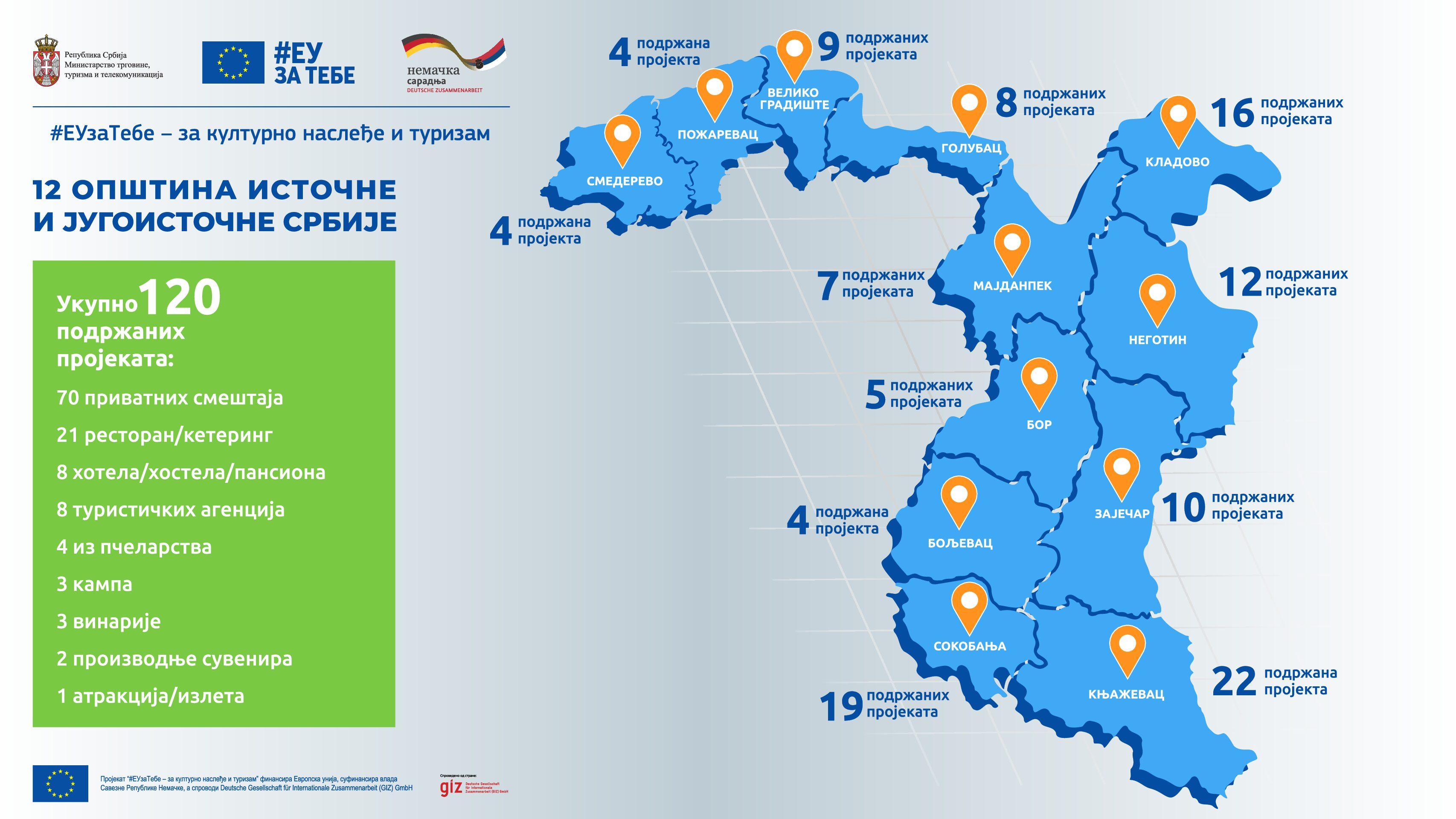 Današnjim online događajem obeležen je zvanično početak dodeljivanja ukupno 120 grantova u okviru projekta „#EUzaTebe – za kulturno nasleđe i turizam“, usmerenih na otklanjanje posledica COVID-19 pandemije u sektoru turizma. Korisnici pomoći su mala i mikro preduzeća, porodična preduzetništva, poljoprivredna gazdinstva i firme iz 12 gradova i opština na istoku i jugoistoku Srbije. Ukupan budžet koji je Evropska unija odvojila za ovu namenu iznosi milion evra.