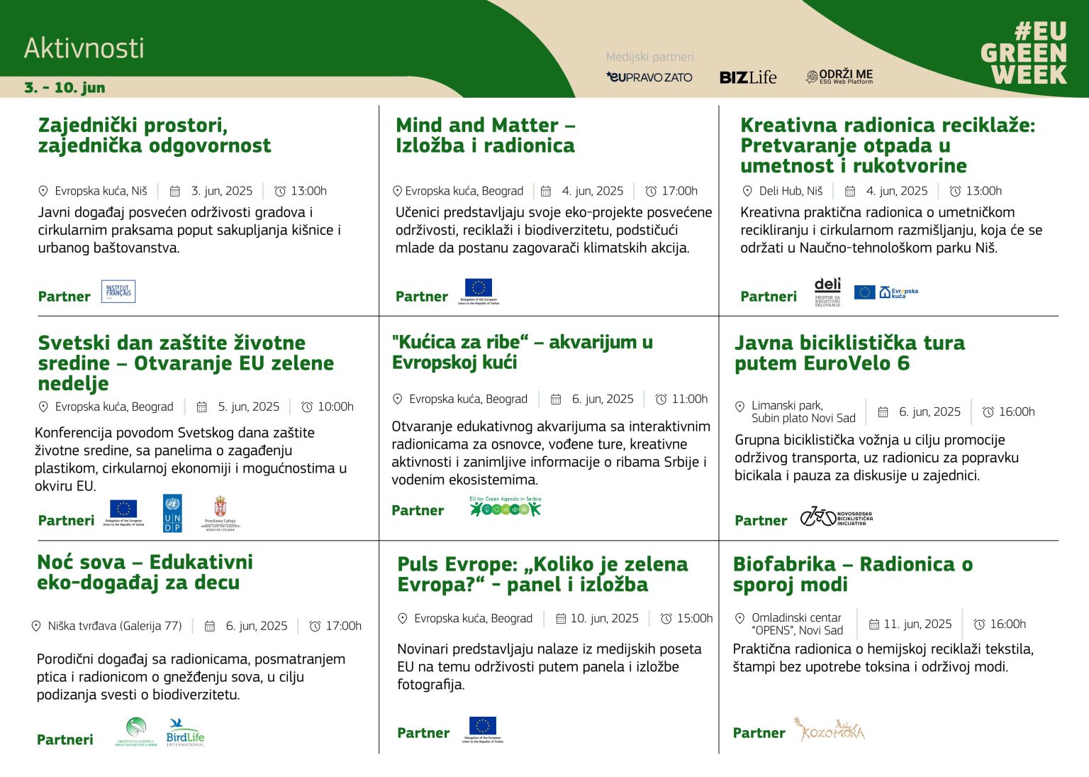 6. jun – Javna biciklistička tura duž EuroVelo 6 rute – Promocija zelene mobilnosti kroz zajedničku vožnju, servis za popravku bicikala i razgovore sa građanima duž važne evropske biciklističke trase.