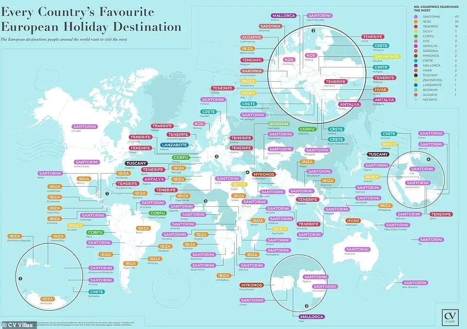 Santorini je na vrhu liste, koju je napravio CV Villas, zahvaljujući tome što je najpopularnije evropsko mesto u 47 zemalja širom sveta, uključujući SAD, Finsku, Kolumbiju, Boliviju, Indiju , Australiju i Novi Zeland.