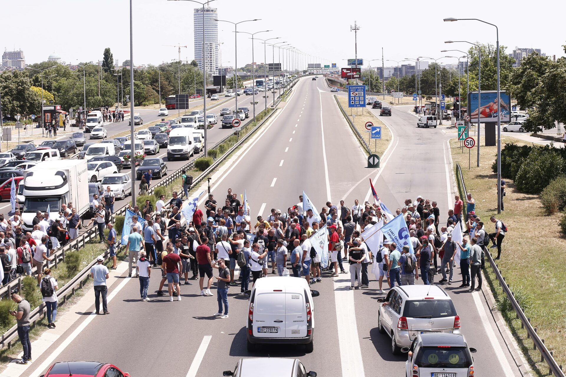 Beograd, 22.06.2022. – Nekoliko stotina radnika kragujevacke fabrike automobila Fijat blokiralo je nesto posle 13 casova deo autoputa kroz Beograd, kod Sava centra, trazeci od Vlade Srbije resenje za probleme koje imaju sa tom italijanskom firmom. (BETAPHOTO/AMIR HAMZAGIC)