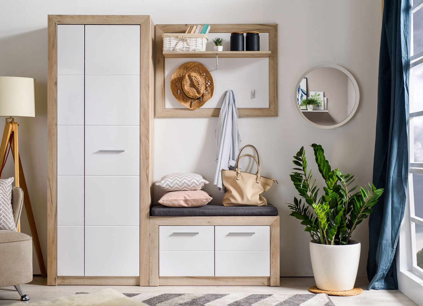 Predsoblje ASTOR u dekoru sivog hrasta i ivica presvučenih belom lak folijom savršen je izbor za svetli nameštaj sa toplinom. Element predsoblja ASTOR P2 praktičan je komad za odlaganje garderobe i obuće, a dizajneri enterijera Forma Ideale savetuju da uz njega kombinujete element predsoblja ASTOR CIV, sa kačilicama i policom za odlaganje, i element predsoblja ASTOR KOM, koji poseduje praktičan zatvoreni segment za odlaganje obuće, kao i tapaciranu površinu za sedenje.