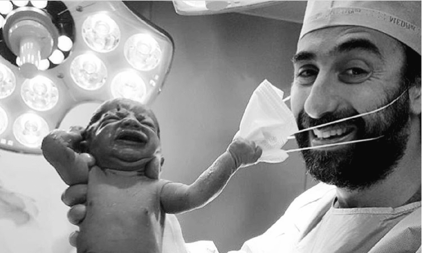 Sliku je na Instagramu podelio ginekolog iz UAE dr Samer Cheaib. Na njoj se vidi novorođenče kako rukom povlači masku s njegovog lica i otkriva lekarov široki osmeh.