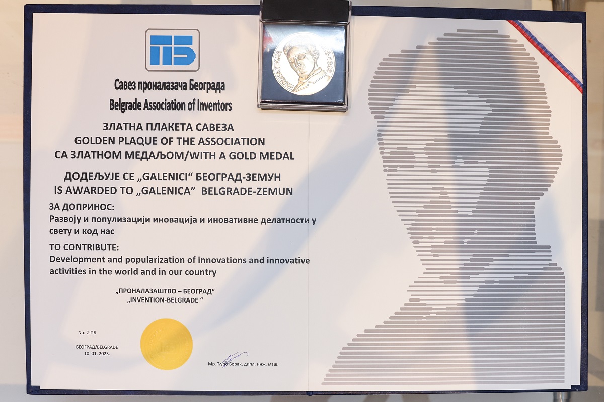 U okviru 37. Međunarodne izložbe pronalazaka, novih tehnologija i industrijskog dizajna, Savez pronalazača Beograda je farmaceutskoj kompaniji Galenika dodelio Zlatnu plaketu sa zlatnom medaljom za doprinos razvoju i popularizaciji inovacija i inovativne delatnosti u zemlji i svetu.