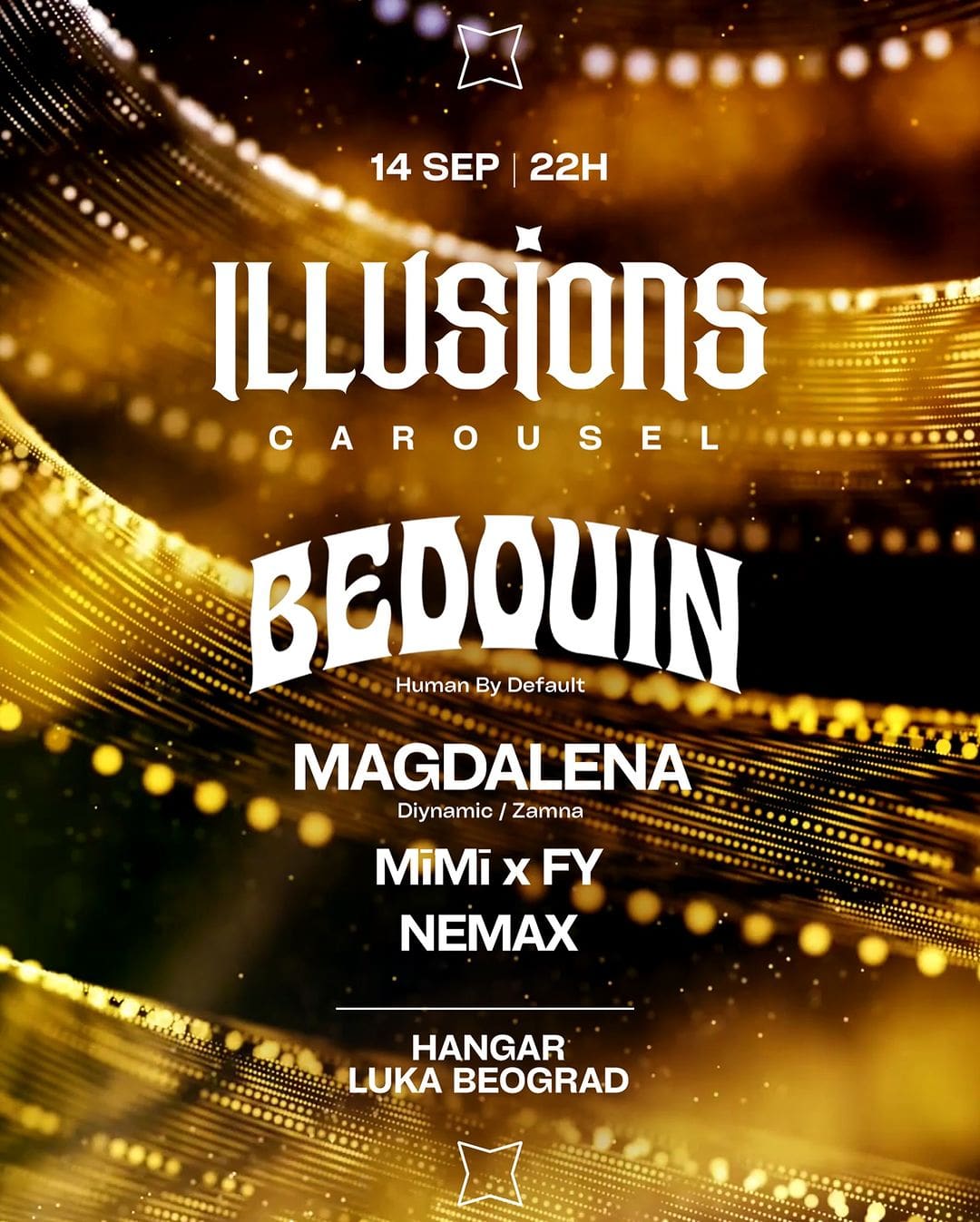ILLUSIONS ne prestaje da nas oduševljava svojim impresivnim line up-om i za kraj letnje sezone, najavljuje spektakularan matinée sa najlepšim zalaskom sunca 14. septembra na Kalemegdanu. Prvi put u Srbiji u Beogradu, nastupaće, najtraženiji izvođači, DJ- duo BEDOUIN, američki produkcijski sastav koji se sastoji od Tamer Malki i Rami Abousabe, dele široku muzičku viziju koja se zasniva na njihovim raznovrsnim uticajima zahvaljujući njihovom bliskoistočnom nasleđu.