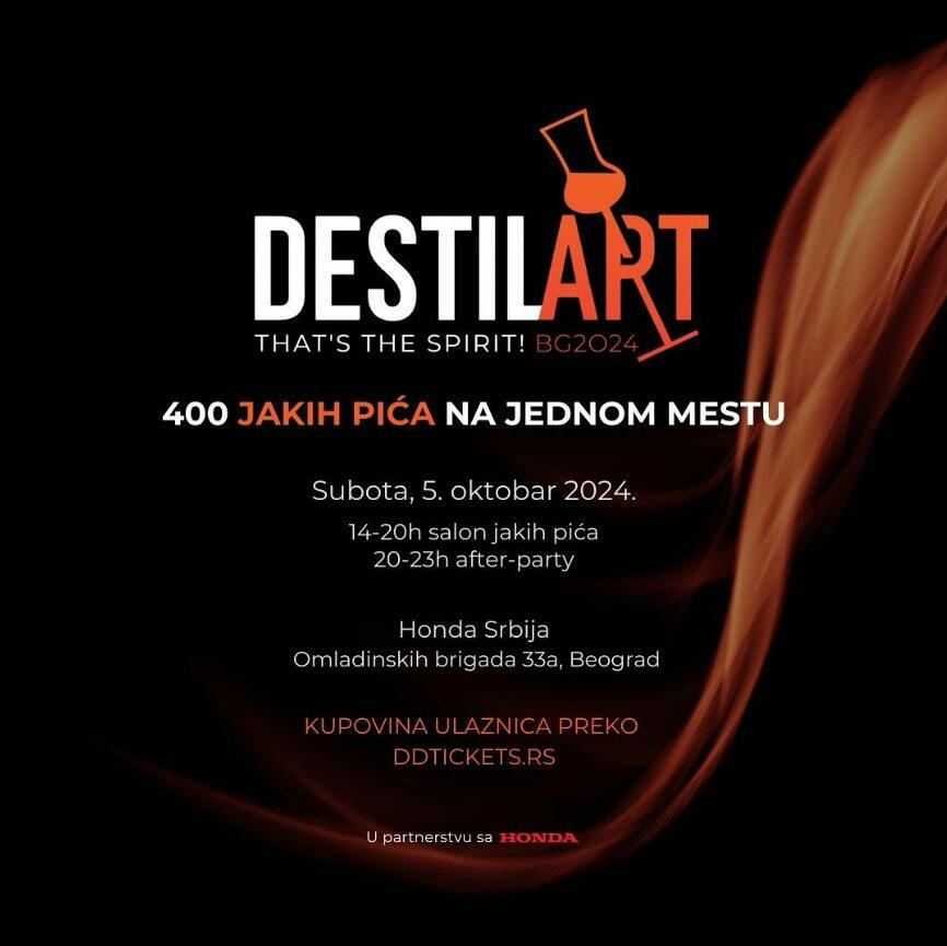 05. oktobra 2024. godine, na ekskluzivnoj lokaciji, u prostorijama Hondinog salona okupljamo najbolje destilerije iz Srbije i sveta. DestilArt, salon jakih pića, okuplja preko 70 izlagača i predstavlja više od 400 etiketa jakih pića. Ovo je jedinstvena prilika da otkrijete raznovrsnu ponudu vrhunskih destilata, upoznate stručnjake iz industrije i uživate u degustacijama. Ova manifestacija je savršeno mesto za sve ljubitelje jakih pića, profesionalce iz industrije i entuzijaste.