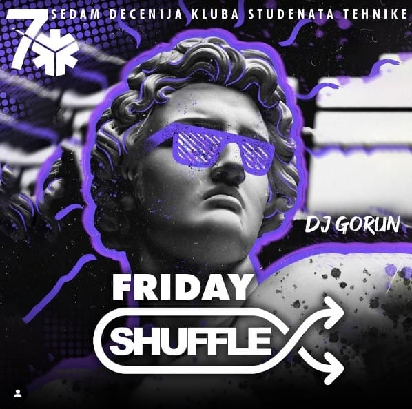 Za kraj duge nedelje DJ Gorun stavlja muziku na SHUFFLE i pravi muzički kolaž hitova svih dekada od 80ih pa sve do danas. Dj Gorun će vam pomutiti pamet puštajući Madonu pa Weeknda, Dvornika pa Benassija, Adelle pa Pitbulla, Maneskin pa Dua Lipu, Doja Cat pa Kungs i tako celu noć Mešamo domaće i strano, staro i novo, Pop i Rock, House i RnB, tehno i balade.