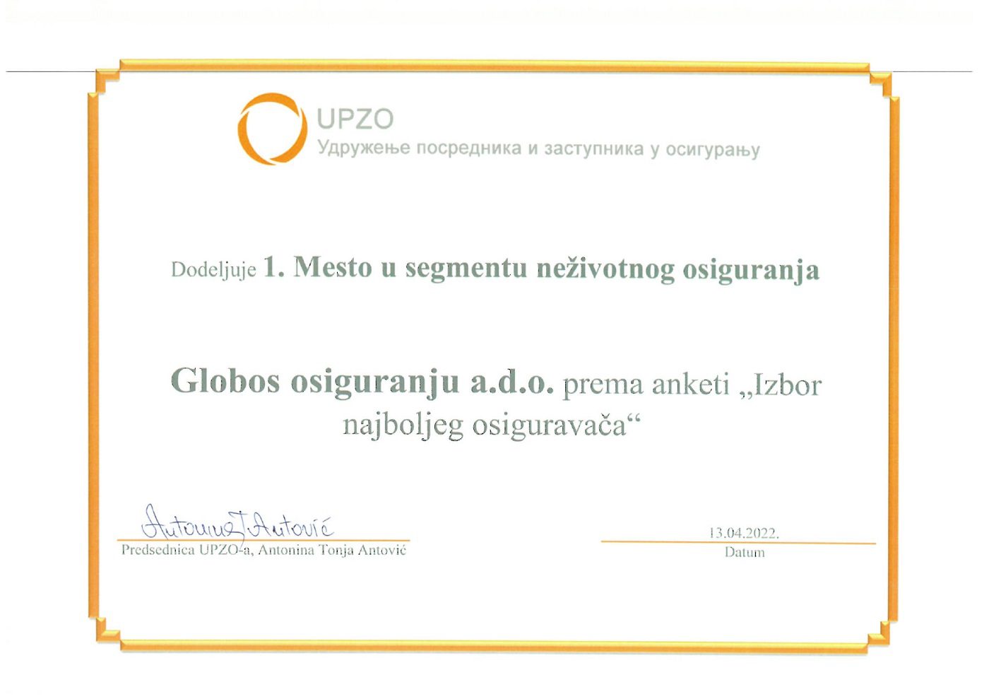 UPZO: Globos osiguranje broj 1 u neživotnom osiguranju