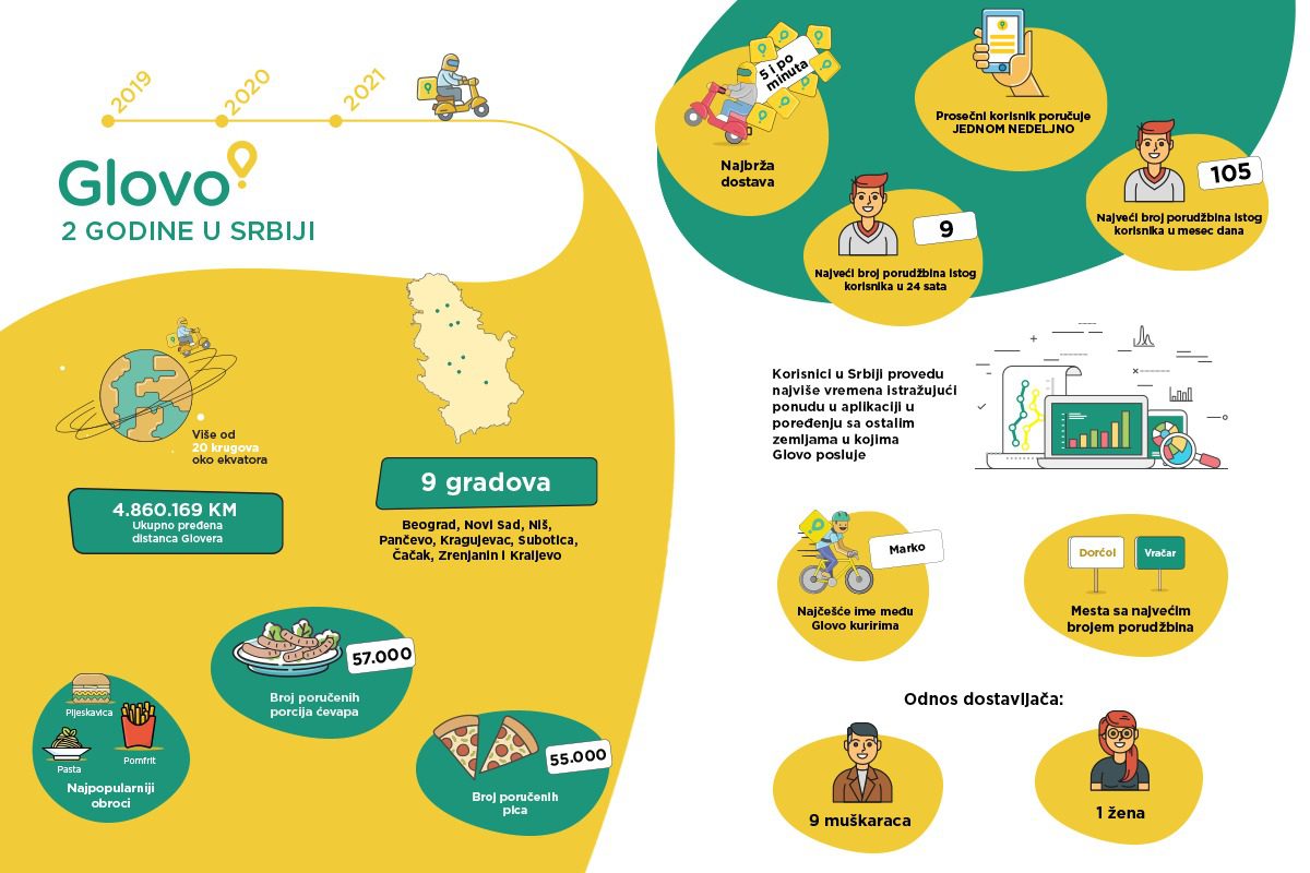 Glovo, jedina platforma u Srbiji koja omogućava poručivanje doslovno „bilo čega“, obeležava drugu godinu od kako je započela poslovanje na našem tržištu. Osim savremene aplikacije, preko koje jednostavno i brzo mogu da se poruče hrana, proizvodi iz maloprodajnih objekata, ili zatraže kurirske usluge, Glovo je doneo i unapređeno korisničko iskustvo, široku ponudu, ali i efikasnost. O tome svedoči činjenica da je najbrža zabeležena dostava kod nas realizovana za neverovatnih pet i po minuta od trenutka poručivanja, a istovremeno, u proteklom periodu izvršeno je preko milion dostava, i isporučeno skoro tri i po miliona proizvoda.
