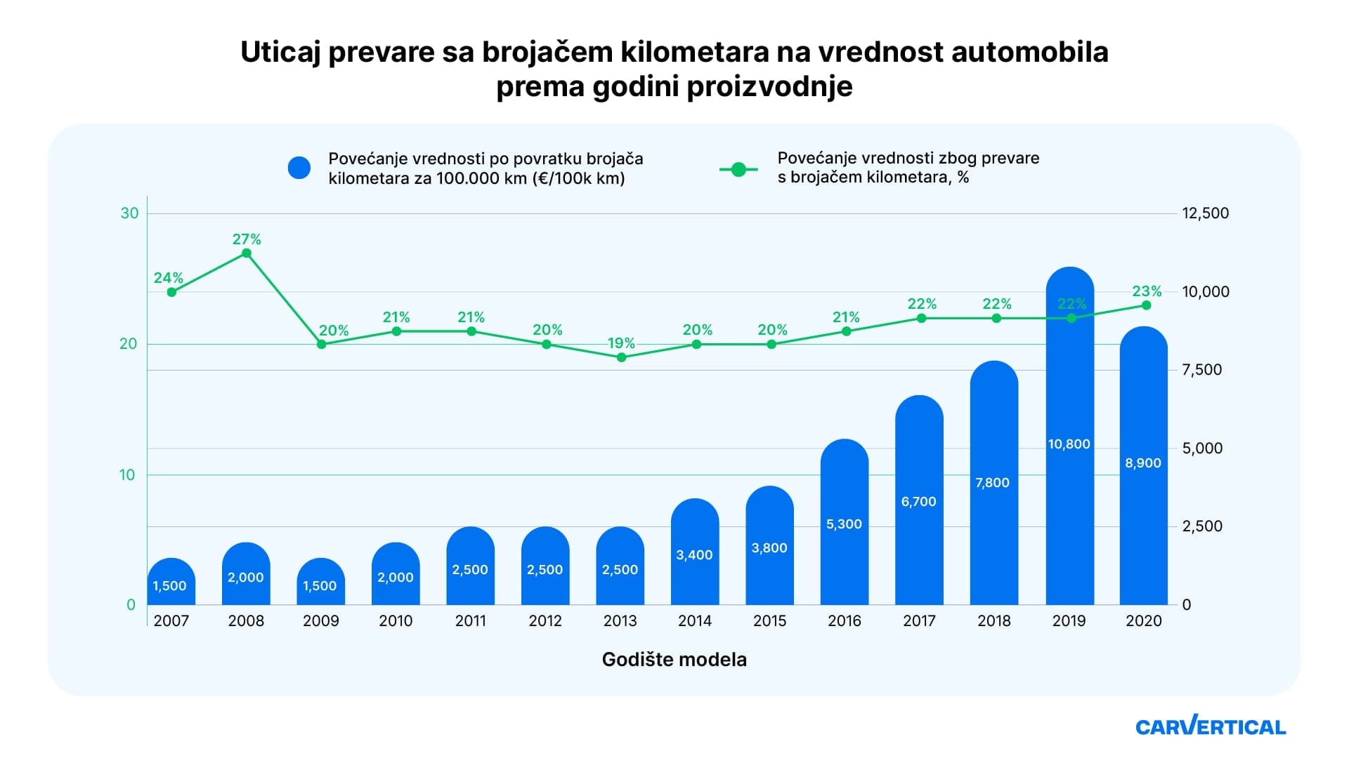 Najnovije istraživanje kompanije carVertical otkriva da se automobil koji ima vraćenu kilometražu može prodati za 21% više od svoje stvarne vrednosti. Ovo znači da mnogi građani Srbije plaćaju više za vozilo, a da ne znaju da su postali žrtve prevaranata.