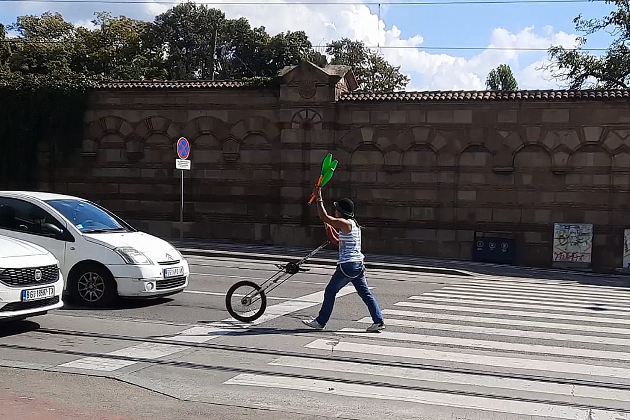 Žonlgiranje čunjevima i šeširom na monociklu, ovaj, kako kažu prolaznici, stranac toliko dobro je uvežbao da mu je dovoljno da privuče pažnju vozača i pešaka za kratkih 30-ak sekundi koliko „drži“ crveno svetlo…