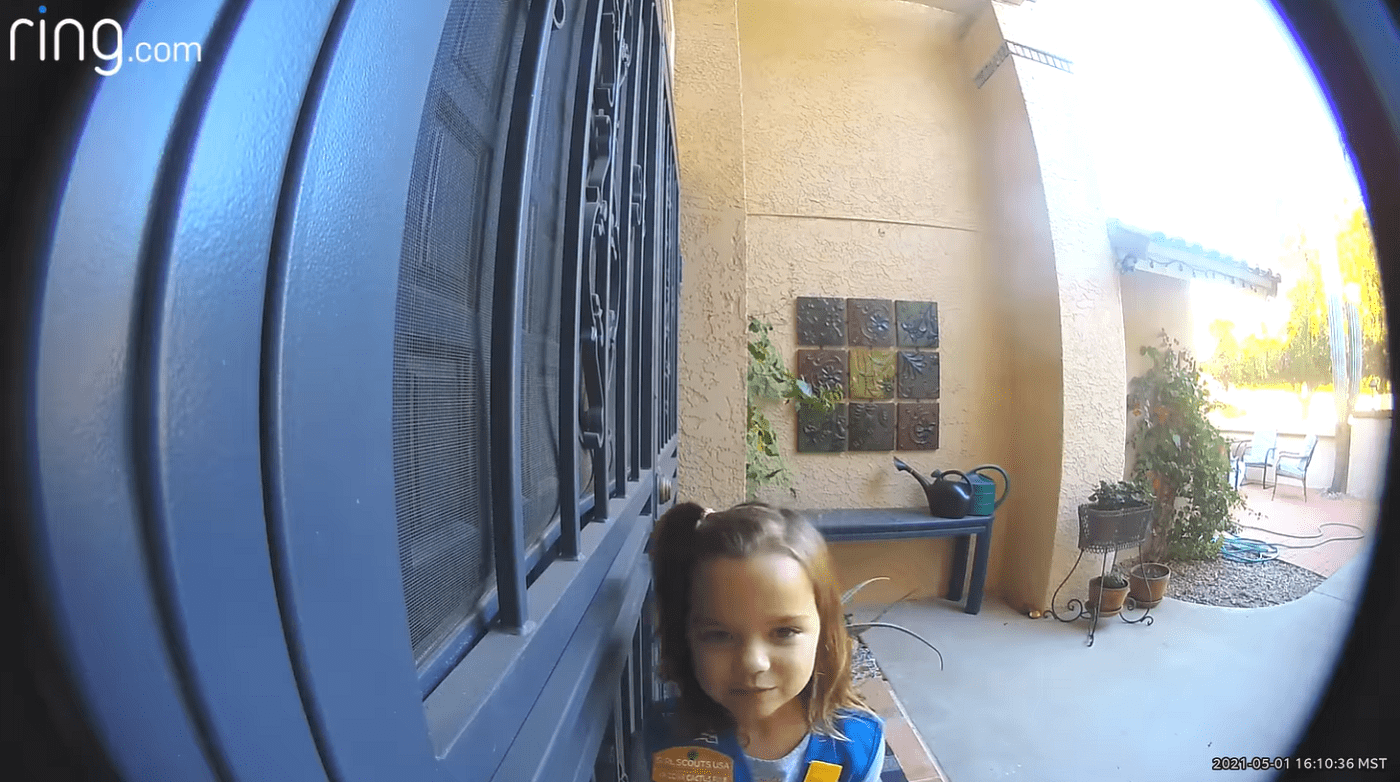 Učenica iz SAD-a došla je na vrata svog komšije i izložila detaljnu ponudu gledajući u kameru na vratima. „Zdravo ja sam Eli. Da li bi želeo da kupiš kolačiće? Kakve kolačiće voliš. Meni su omiljeni ljubičasti. Možete ih kupiti za 5 dolara po komadu pa… da li bi želeo jedan? Ili dva? Ili tri ili četiri ili pet ili šest ili sedam ili osam ili devet ili deset? Možda 11 ili 12“ može se čuti kako ljubazno pita kameru dok pokušava da proda kolače.