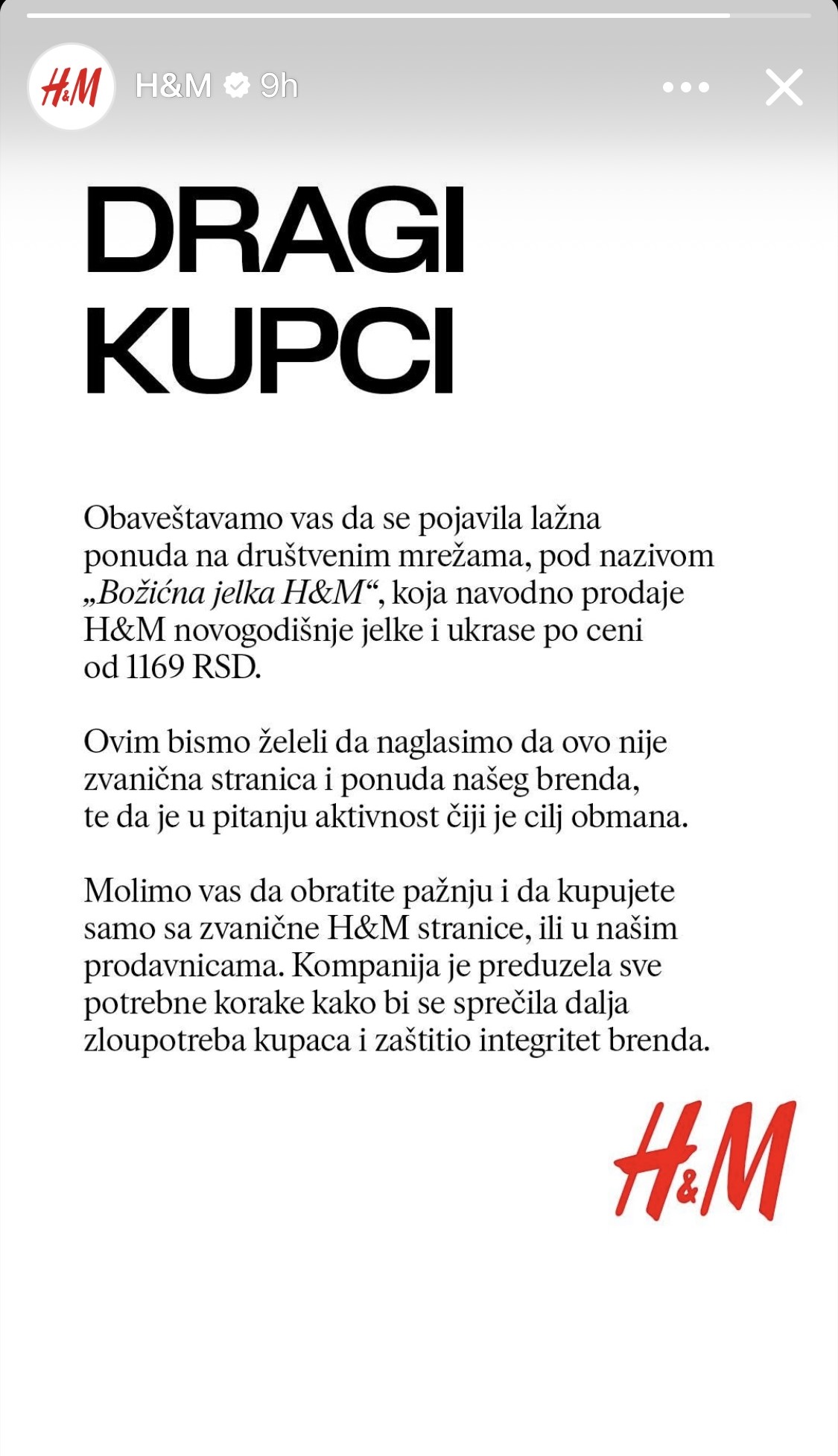 „Obaveštavamo vas da se pojavila lažna ponuda na društvenim mrežama, pod nazivom ‘Božićna jelka H&M’, koja navodno prodaje H&M novogodišnje jelke i ukrase po ceni od 1169 RSD. Ovim bismo želeli da naglasimo da ovo nije zvanična stranica i ponuda našeg brenda, te da je u pitanju aktivnost čiji je cilj obmana. Molimo vas da obratite pažnju i da kupujete samo sa zvanične H&M stranice, ili u našim prodavnicama. Kompanija je preduzela sve potrebne korake kako bi se sprečila dalja zloupotreba kupaca i zaštitio integritet brenda“, navedeno je na stranici modnog lanca.