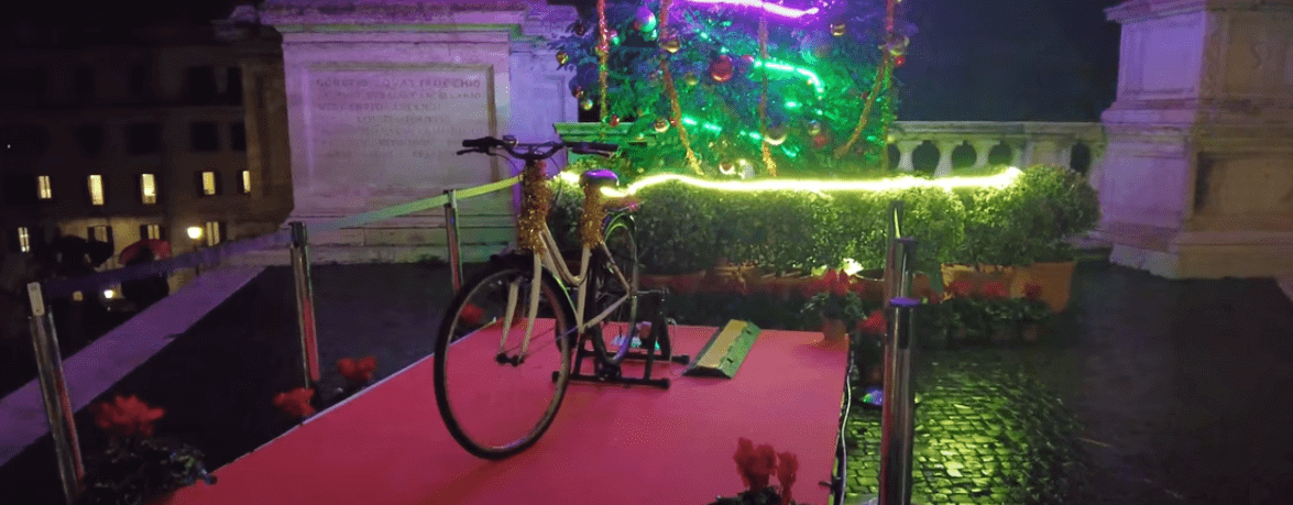 Tako je glavna novogodišnja jelka ispred zgrade rimske gradske većnice na Piazzi del Campidoglio ove godine osvetljena pomoću bicikala koji generišu napajanje.